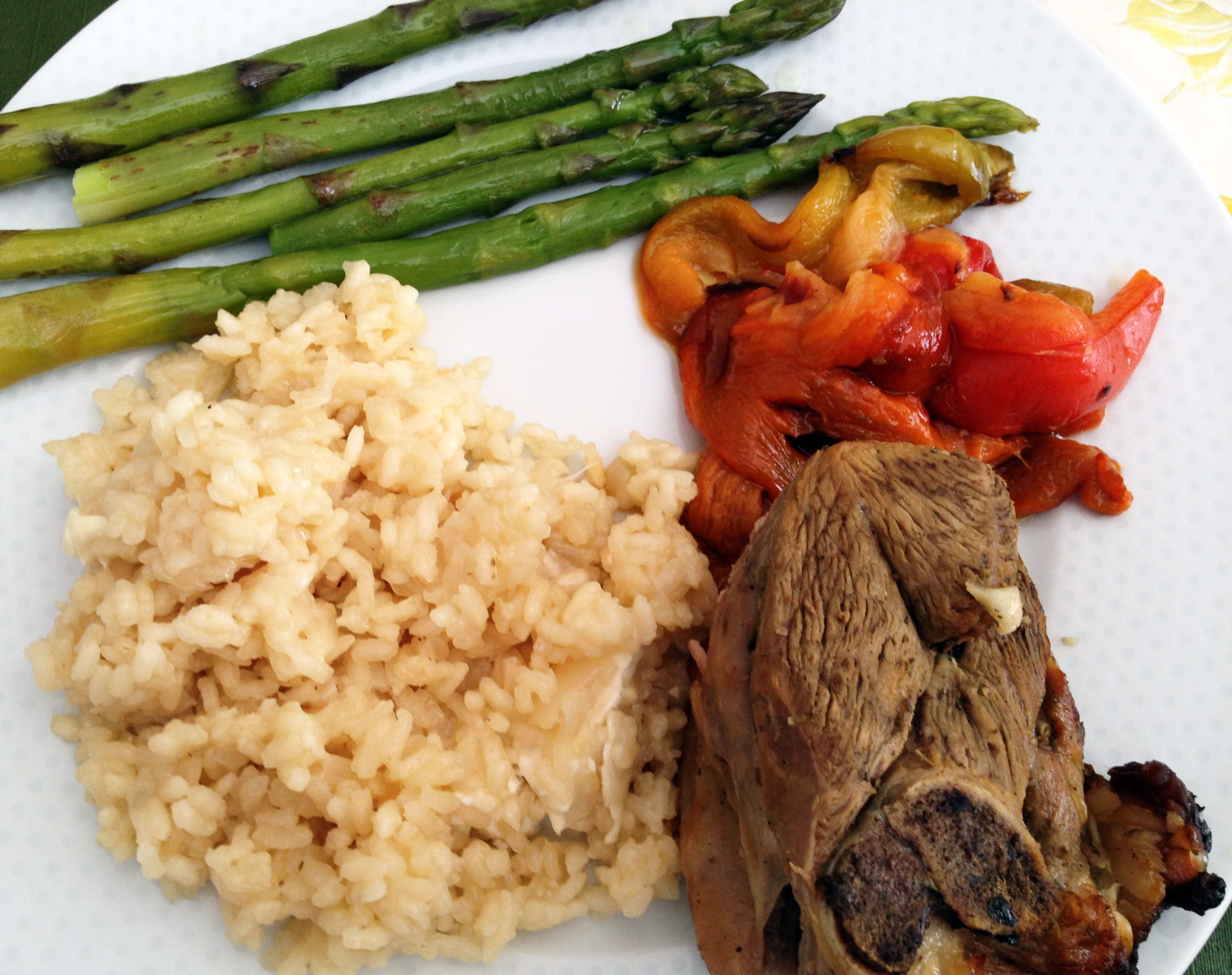 och till varmrätt vitlöksspäckad lammstek med chevré-risotto, sparris och de grillade paprikorna.
