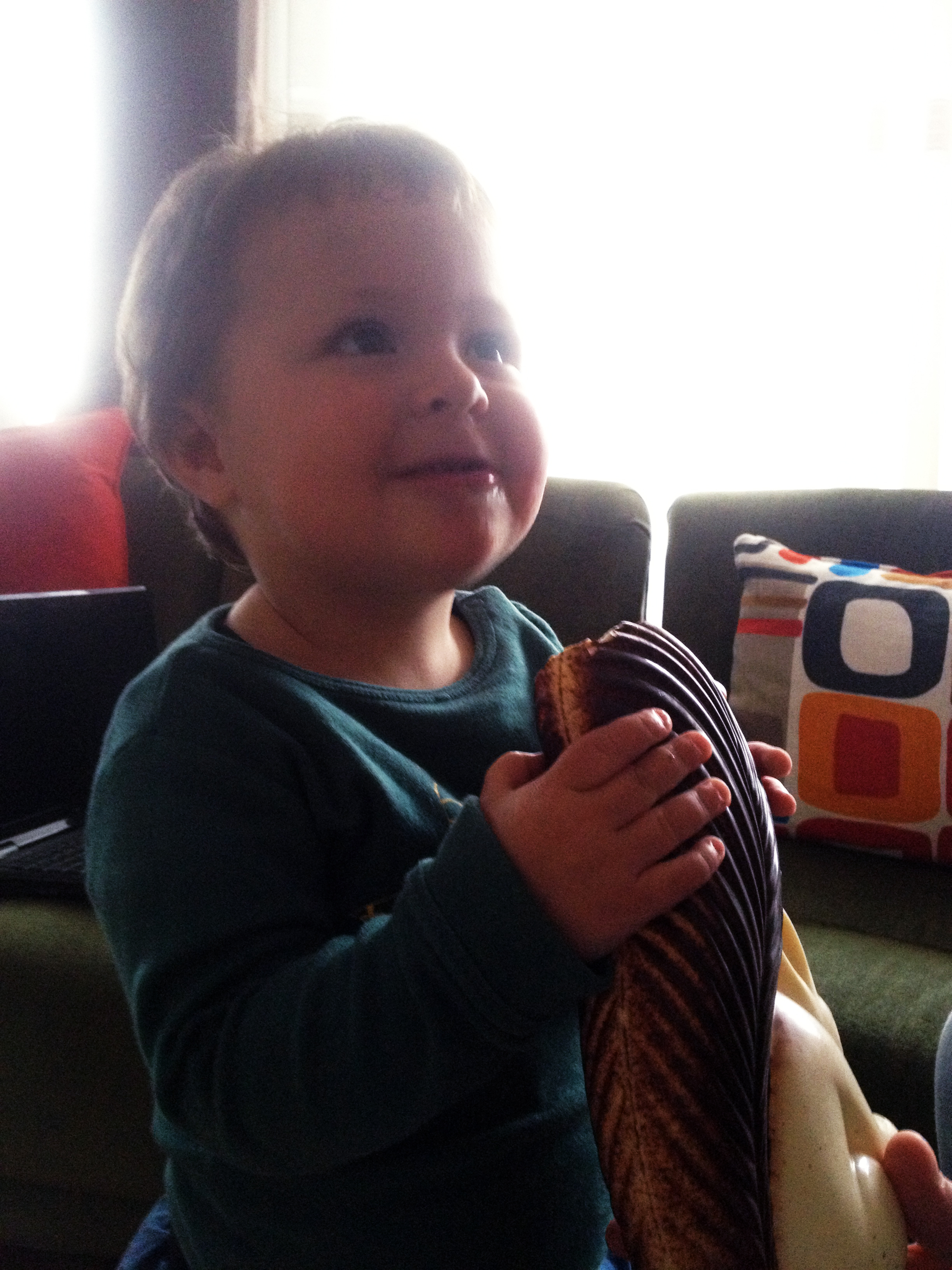 och deras son Didak som blev superlycklig över sin påskekorre i choklad.