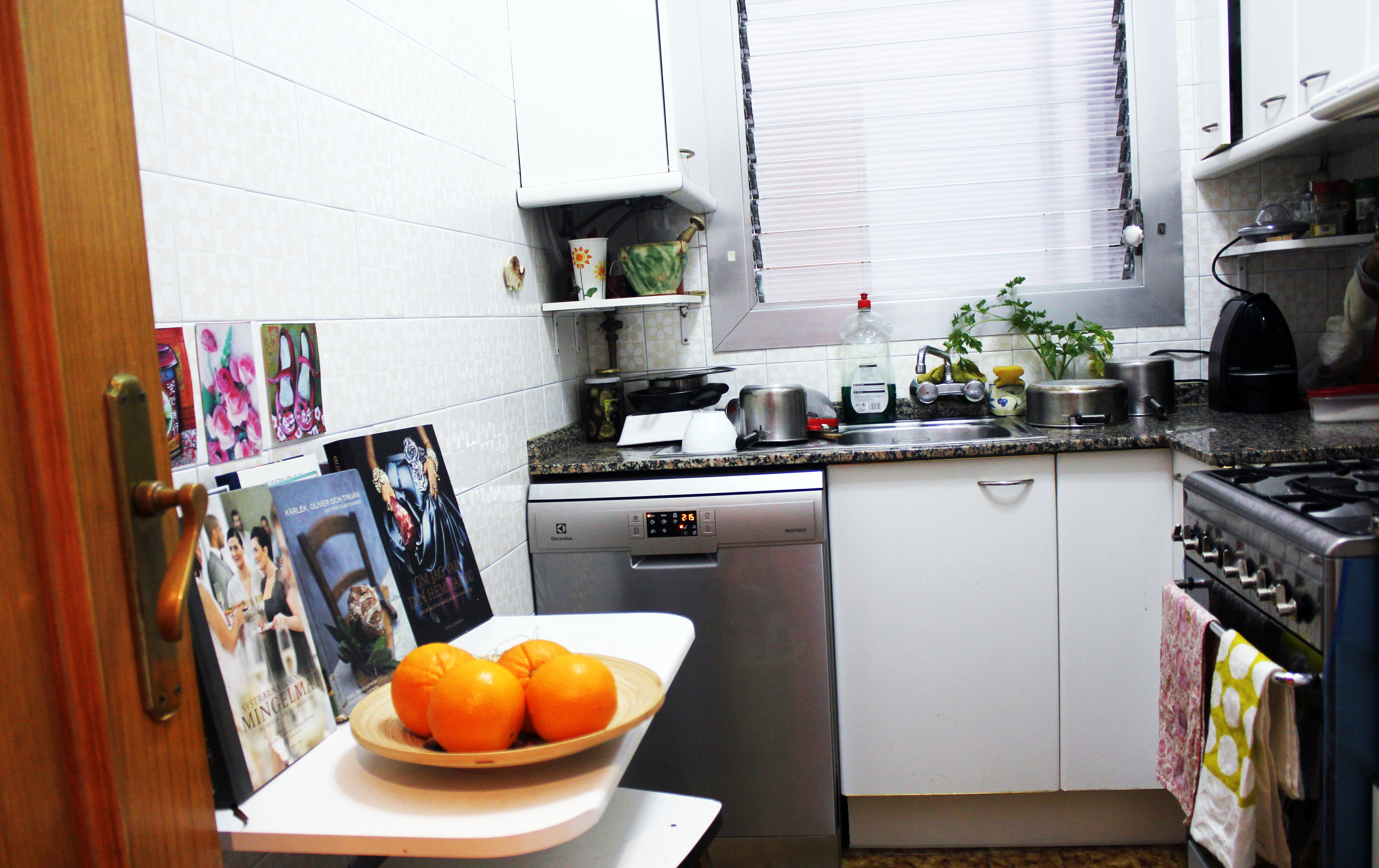 Så här ser det ut i vårt hem. Köket är inte stort, men jag är glad över att jag lyckats få mina kokböcker dit.