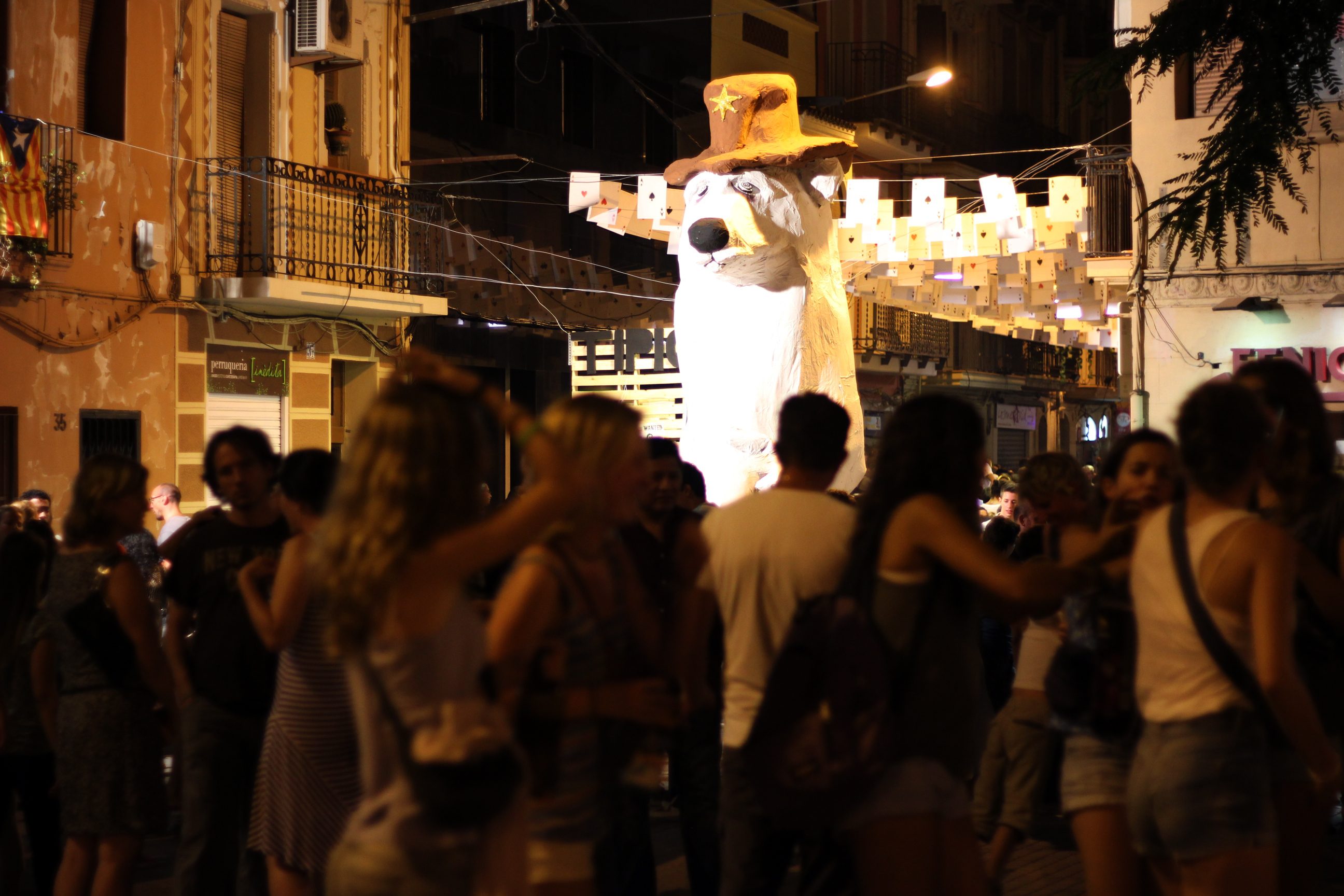 Efter popcorn i biomörkret åkte vi till stadsdelen Sants i Barcelona som denna helg firar med fiesta.