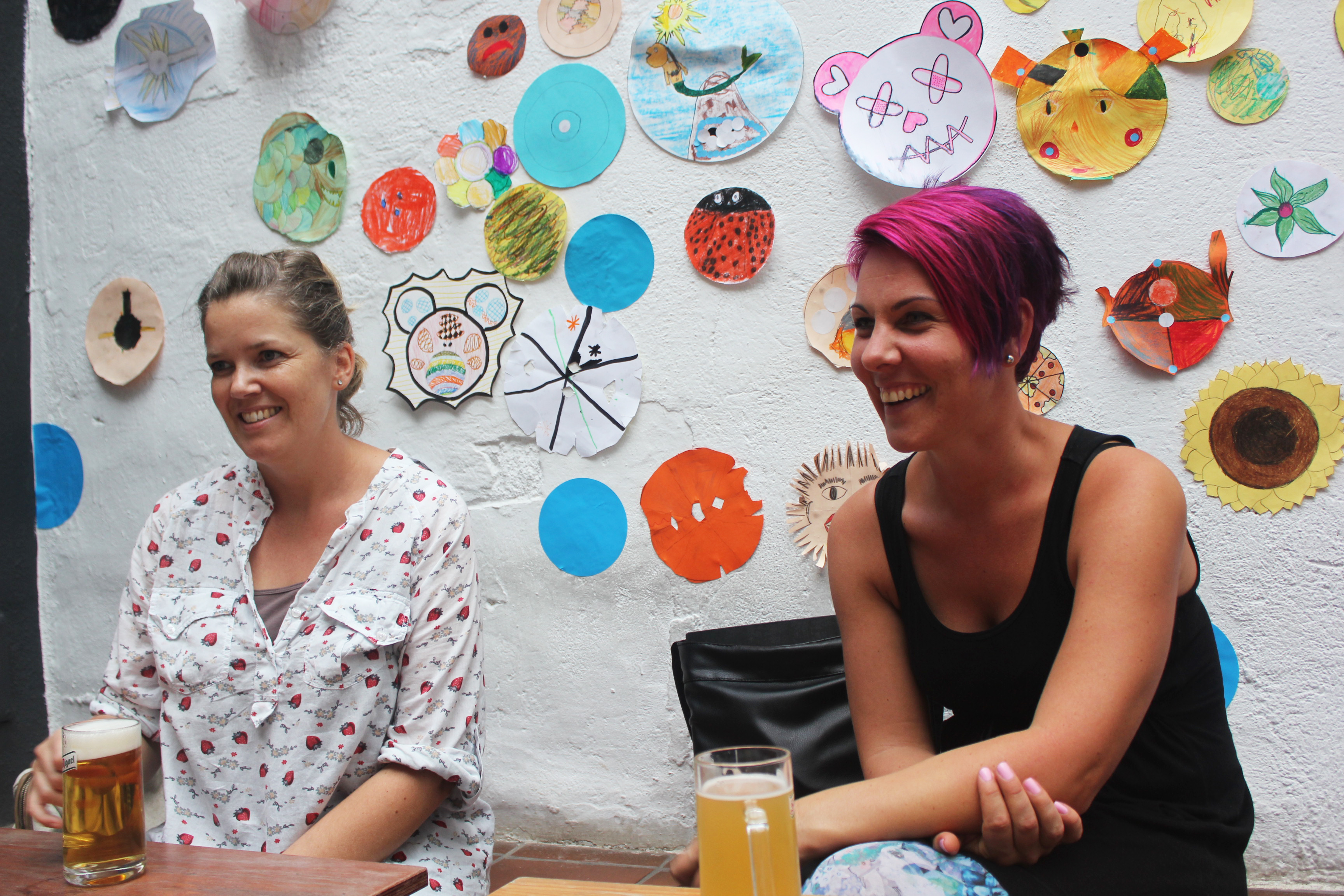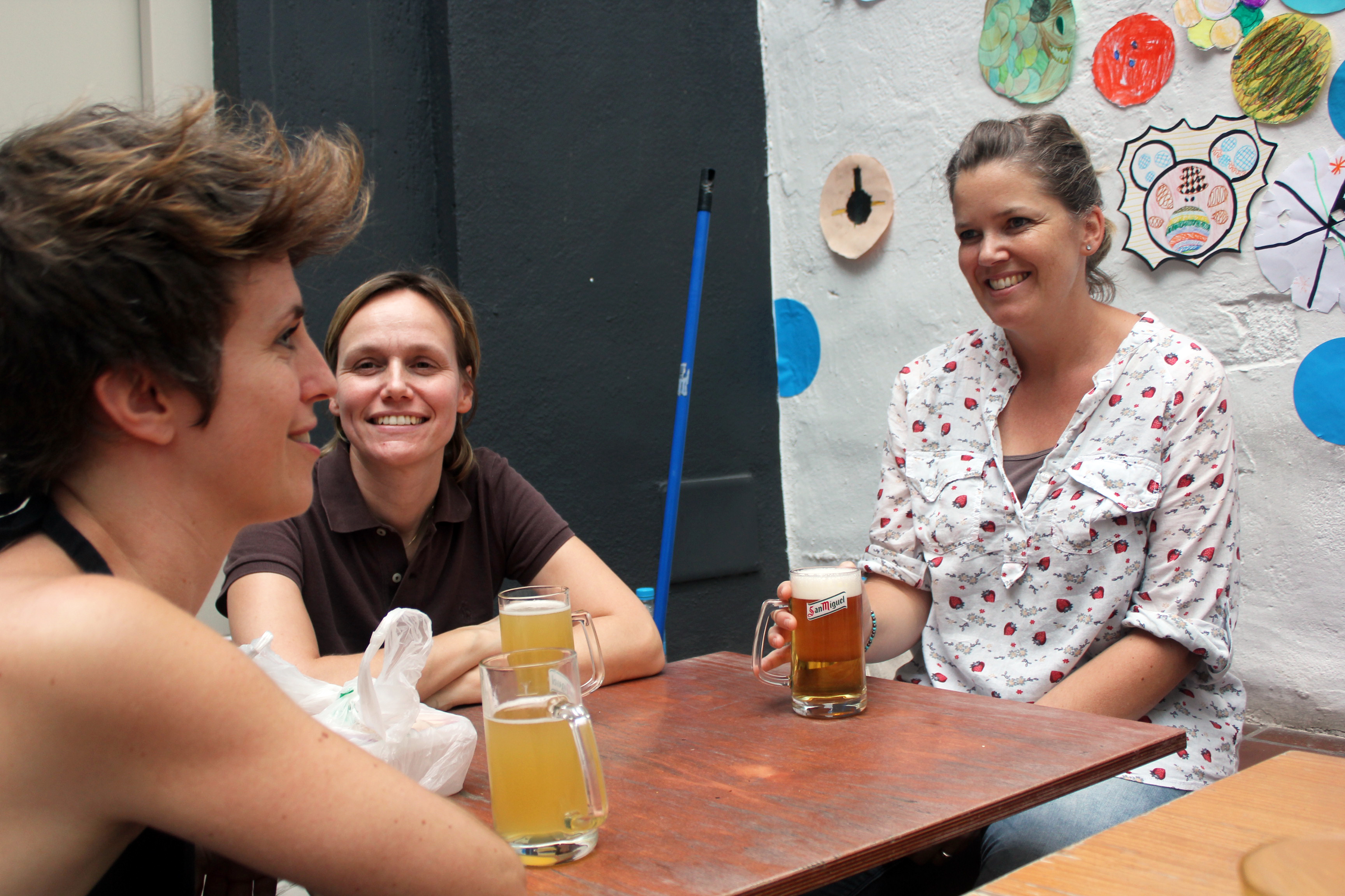 och Maria, Lina och Trude efterpå när vi gick och tog en öl i teaterbarens trädgård i närheten av övningslokalen.