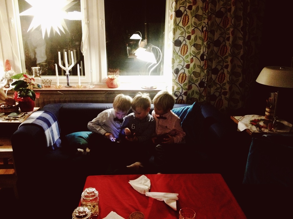 Här kommer en liten uppdatering från min mobil. Min dator kraschade nämligen igår efter en olycka med utspilld dryck. Det verkar ordna upp sig men just nu är det lite kaos. Datorn är hela mitt kontor som frilansjournalist. hur som helst är jag nu på väg till Sverige för att fira nyår! Bilderna nedan är från juldagen när skäkten traditionsenligt var samlad. Denna gång hos Eva, Vendela o Linnea. En väldigt julig o väldigt fin kväll!