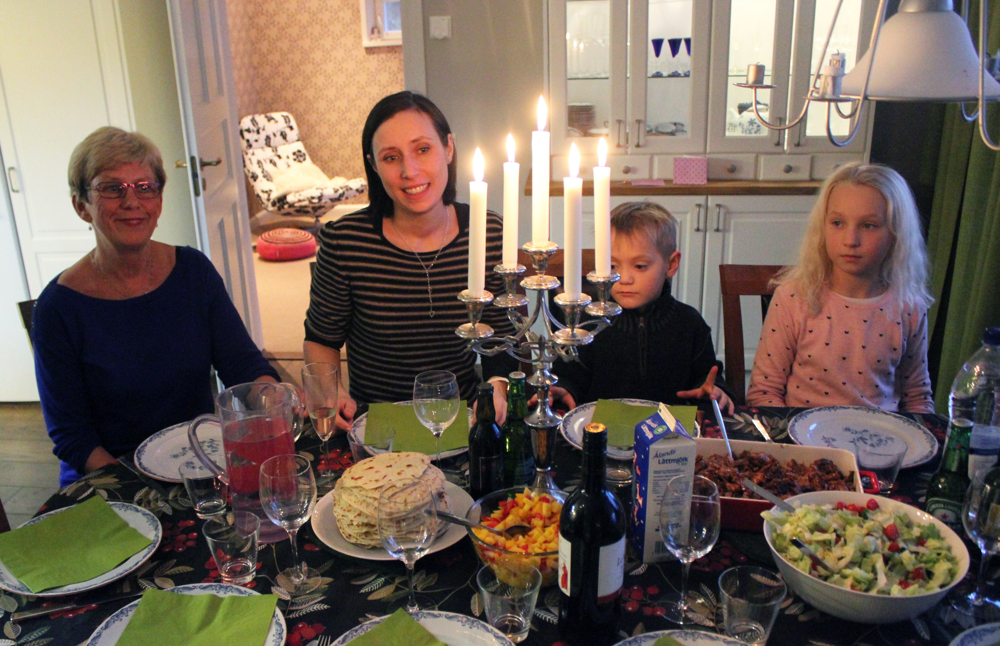 Mamma, Åsa, Olle och Malva. Och titta där på bordet. Ser ni tortillabrödet och den mumsiga mangosalsan?