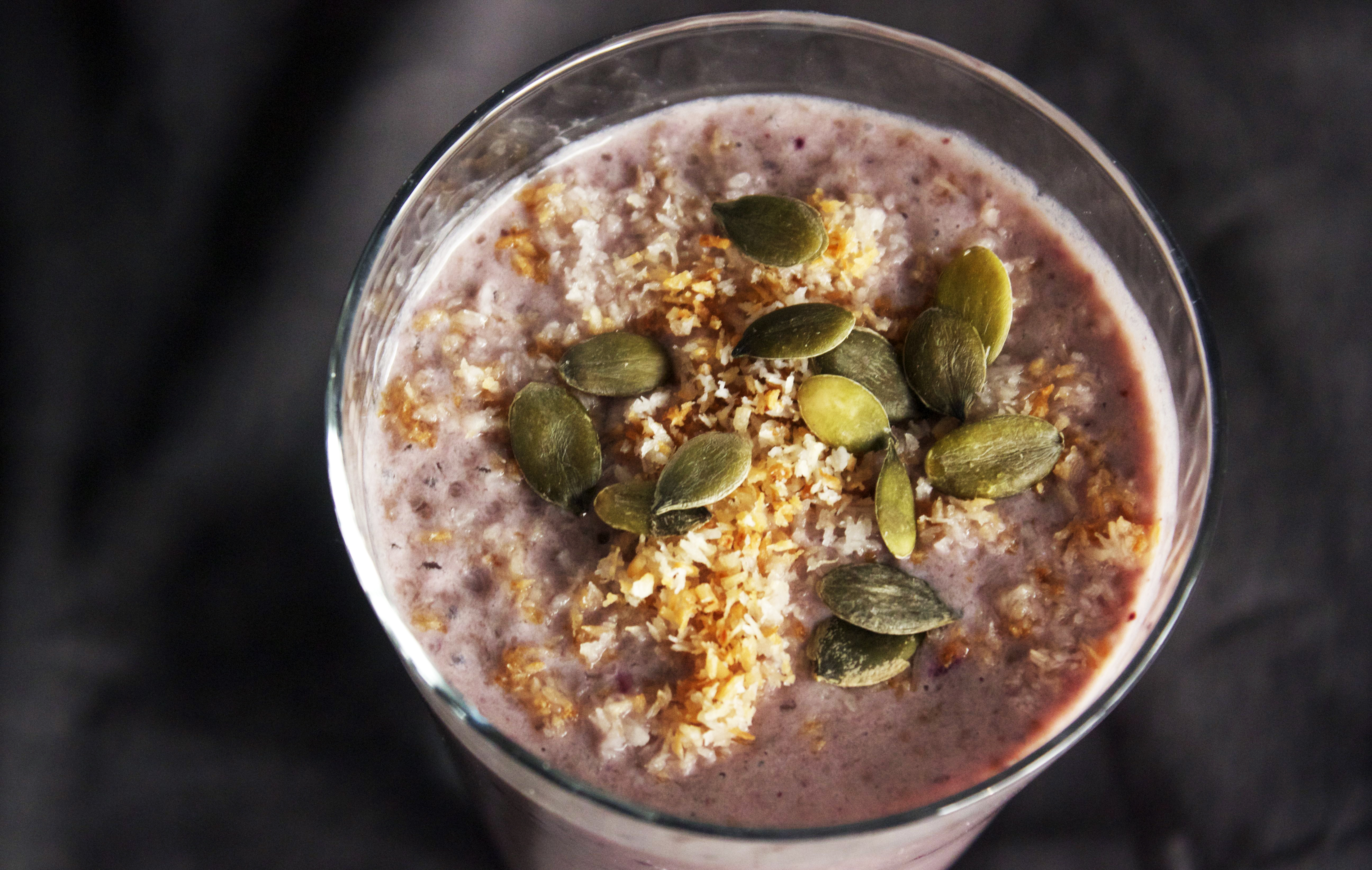 Mixa allt slätt och häll upp i två stora glas. Toppa med pumpakärnorna och kokosflingorna.