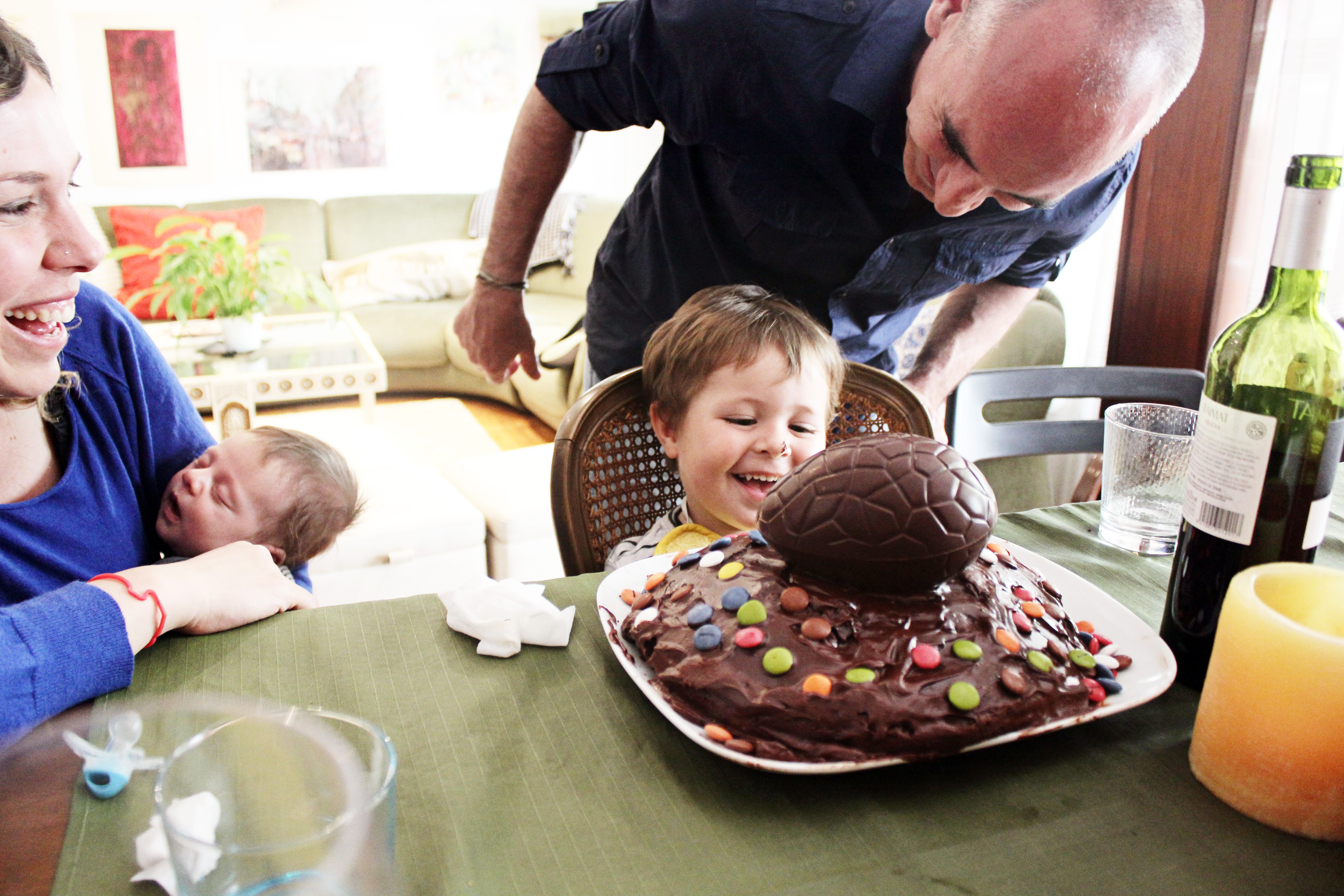 Här är det tradition att äta chokladkaka på påskdagen med ett jättestort chokladägg på, La Mona. Det är gudföräldrarna som ska ge det till sina gudbarn och eftersom Edu är gudfar till Didak försökte jag få till en sådan kaka. Att döma på hans min så fick den godkänt.