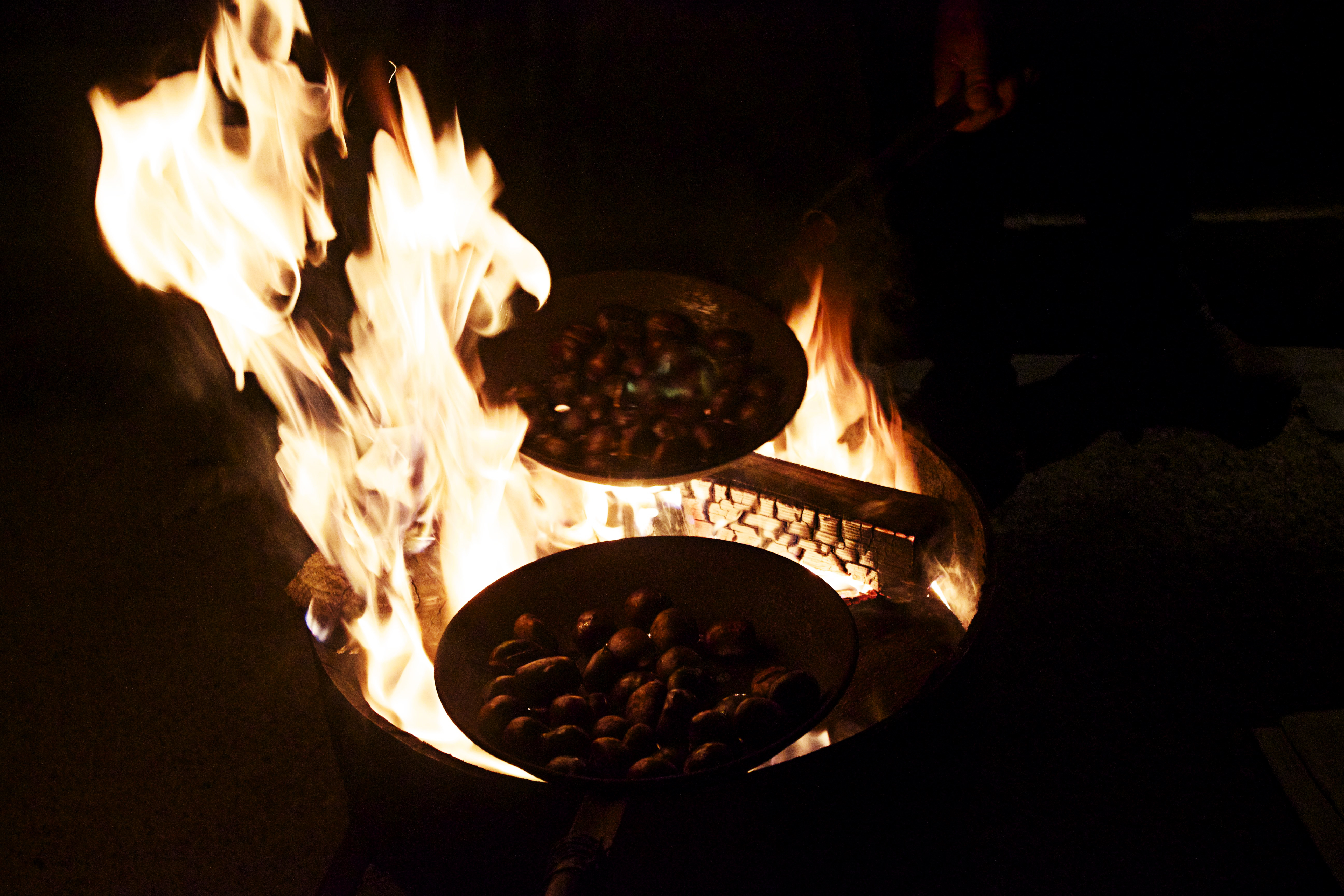 På kvällen efter vår avslappnade lunch i trädgården var det dags för ”La Castanyada”, som är en allhelgona-tradition här. Då rostar man kastanjer över öppen eld och äter dem tillsammans med sötpotatis i ugn och bakelserna jag pratade om i förra inlägget, de så kallade ”panellets”. Vi tände ljus och satte oss ute i mörkret på altan och skalade kastanjer så att våra fingrar blev alldeles sotiga och ansiktet med.Dessutom drack vi lite sött portvin till. Bästa sättet att avsluta en lördagkväll på.