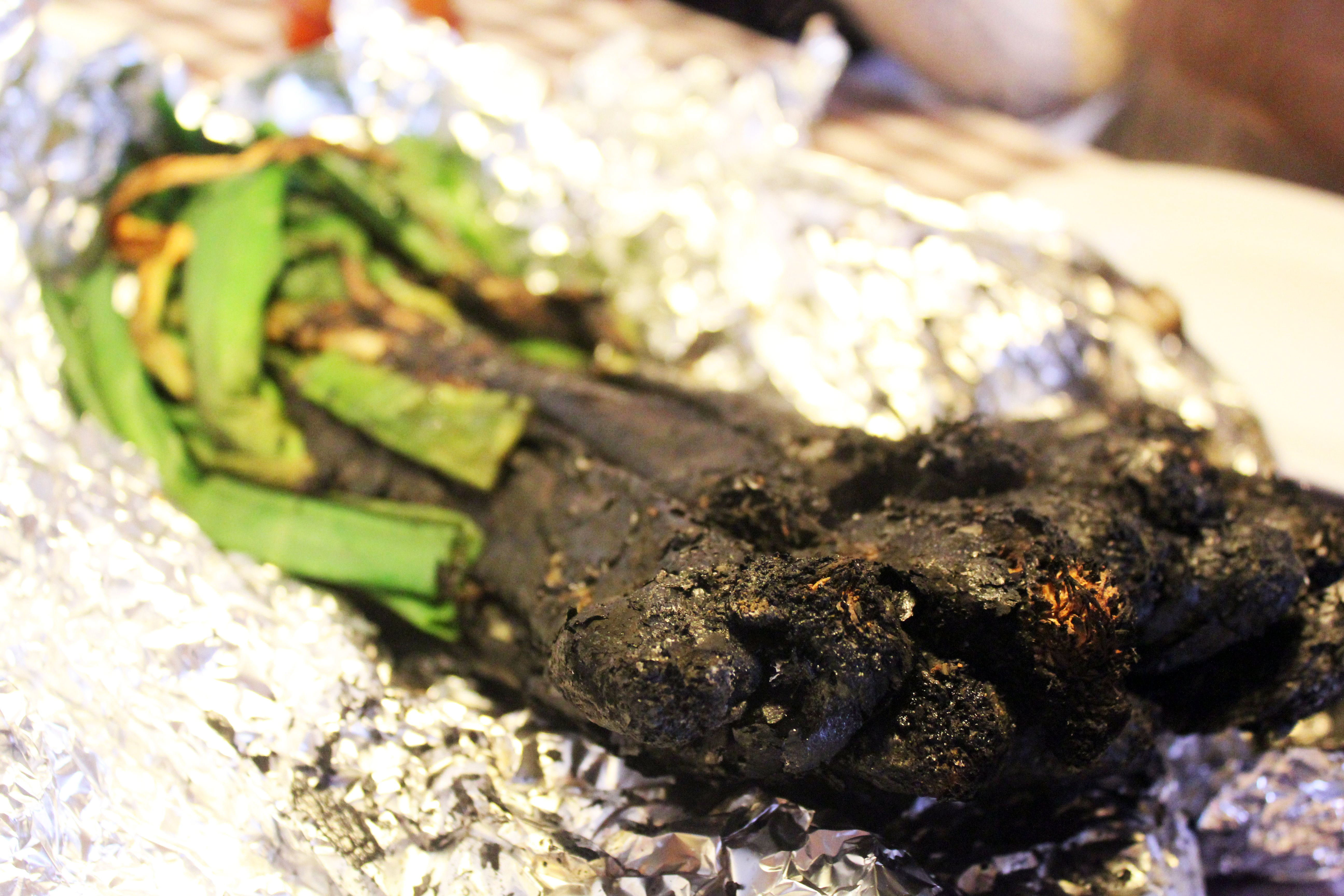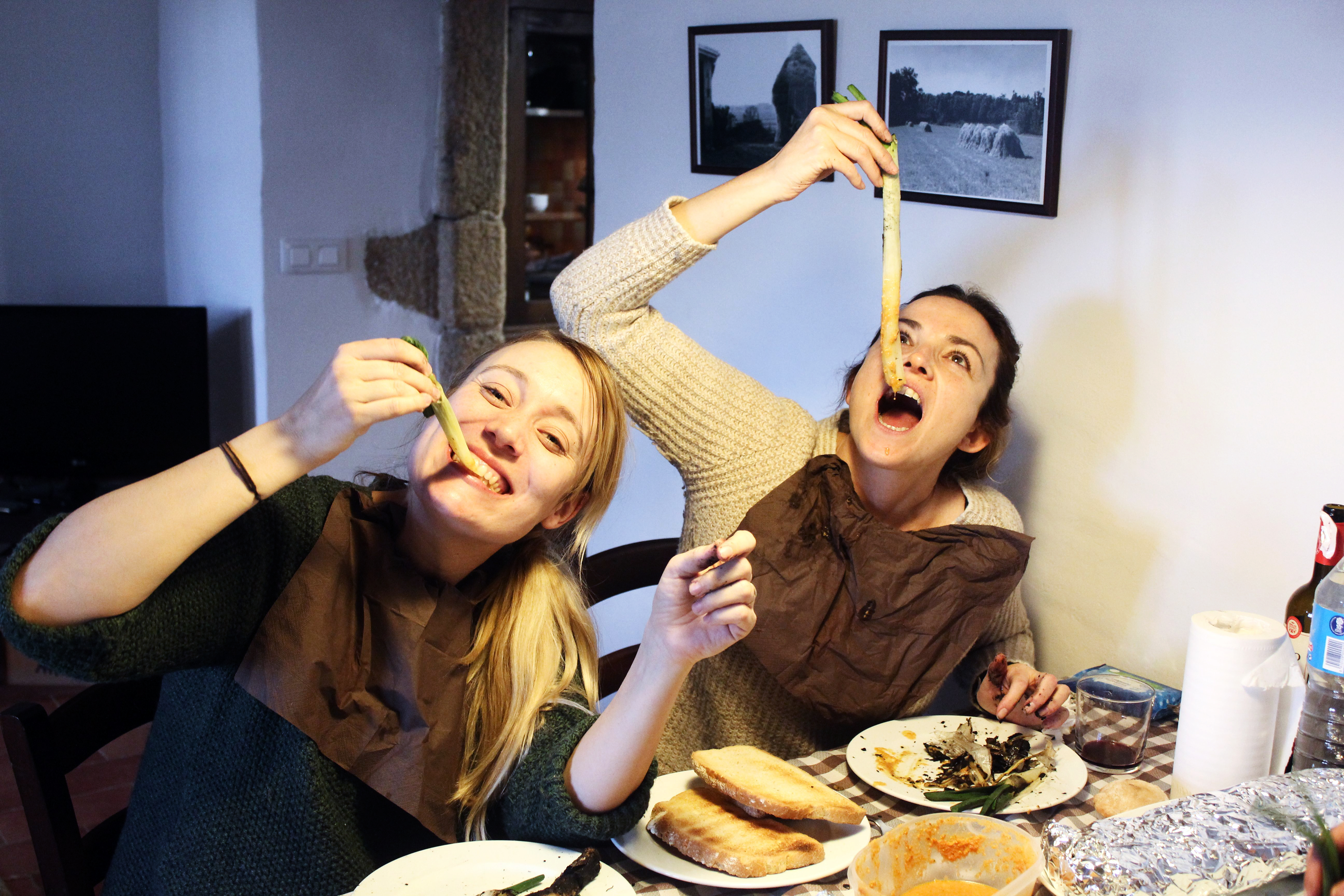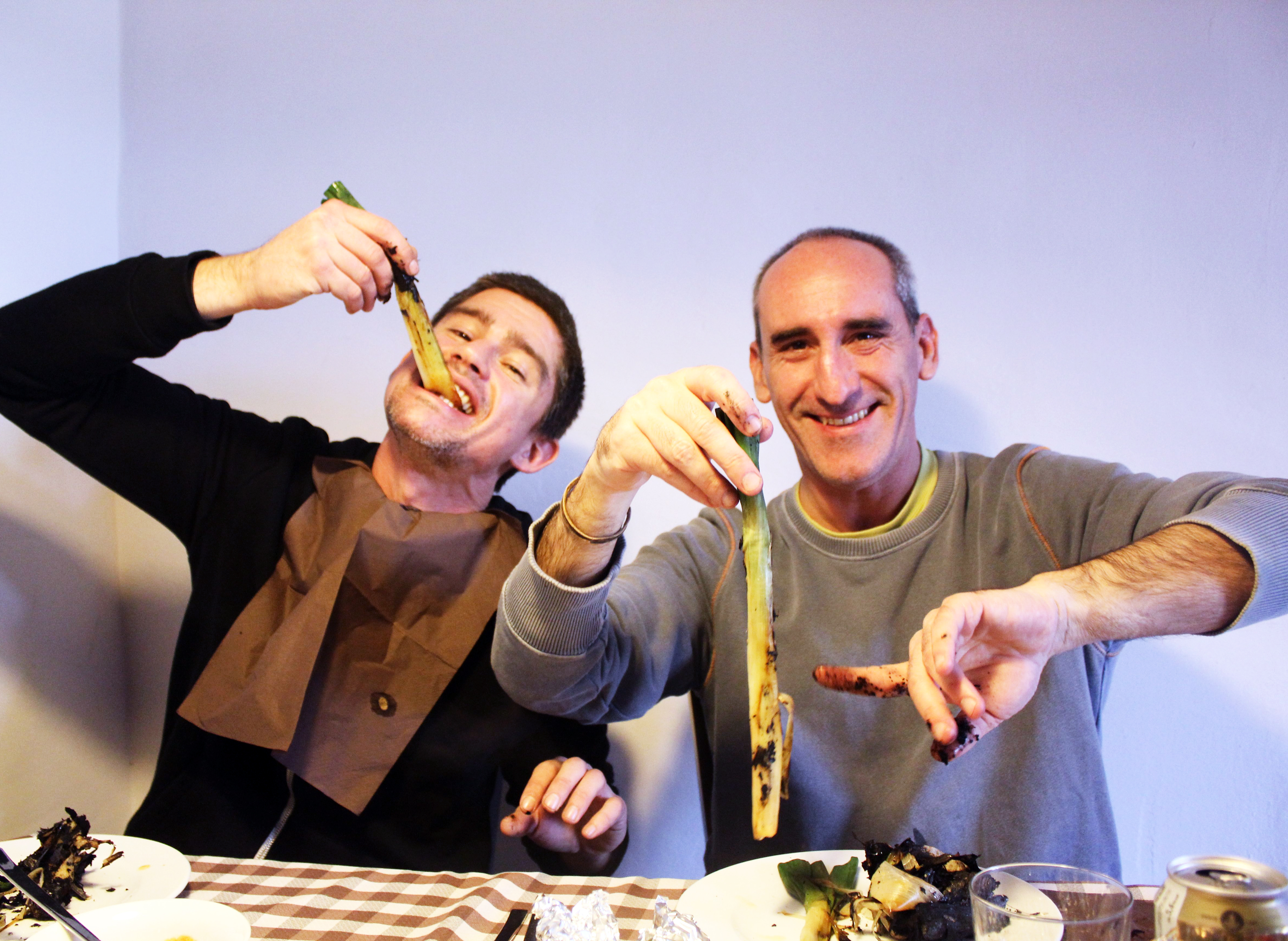 På en marknad inne i byn hittade vi färska calzots. Det är säsong på dem nu och vi grillade dem över öppen eld enligt tradition tills de såg ut så här: