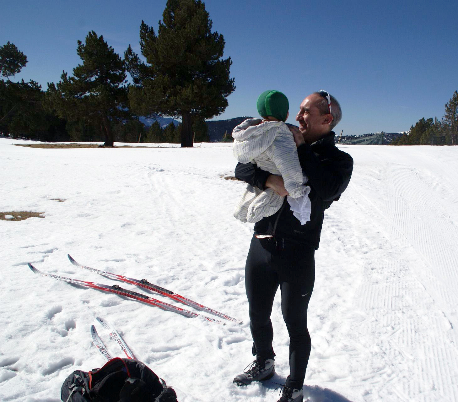 Så vi packade ner Juni i en liten pulka som man kan ha efter sig i en sele när man åker ner för backarna. Hon tyckte det var jättekul och det måste ha varit sövande också. Hon sov hela två timmar i sträck.