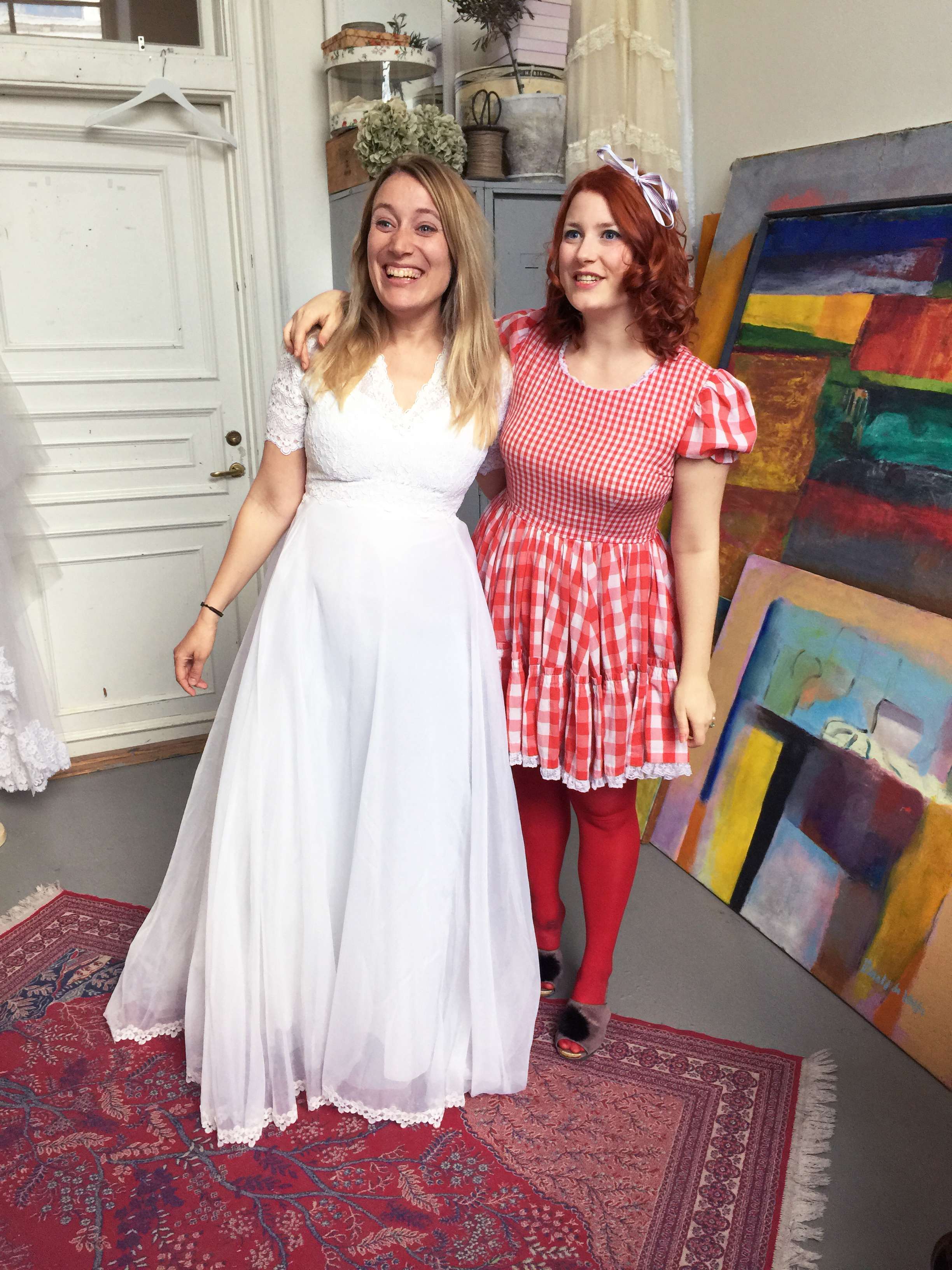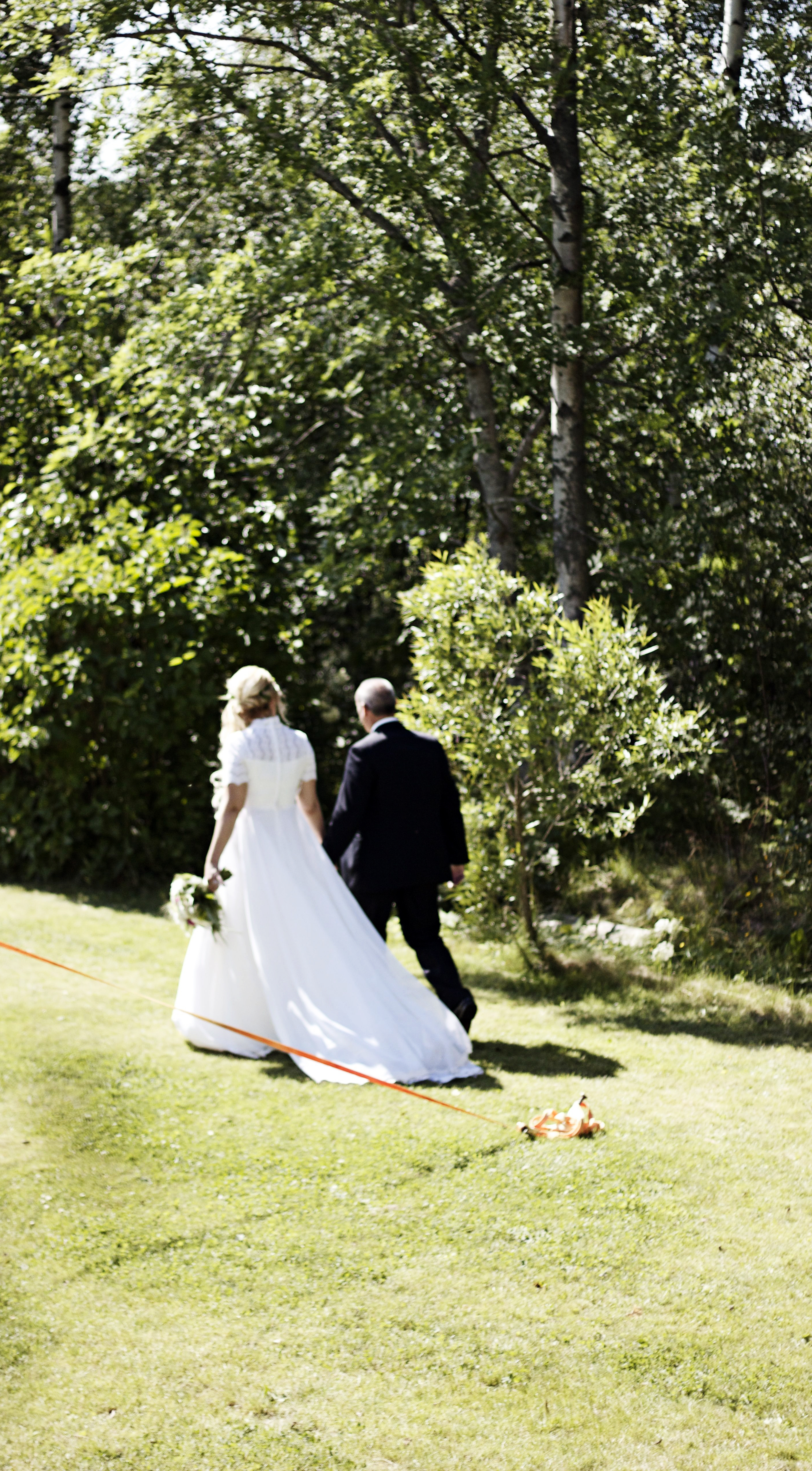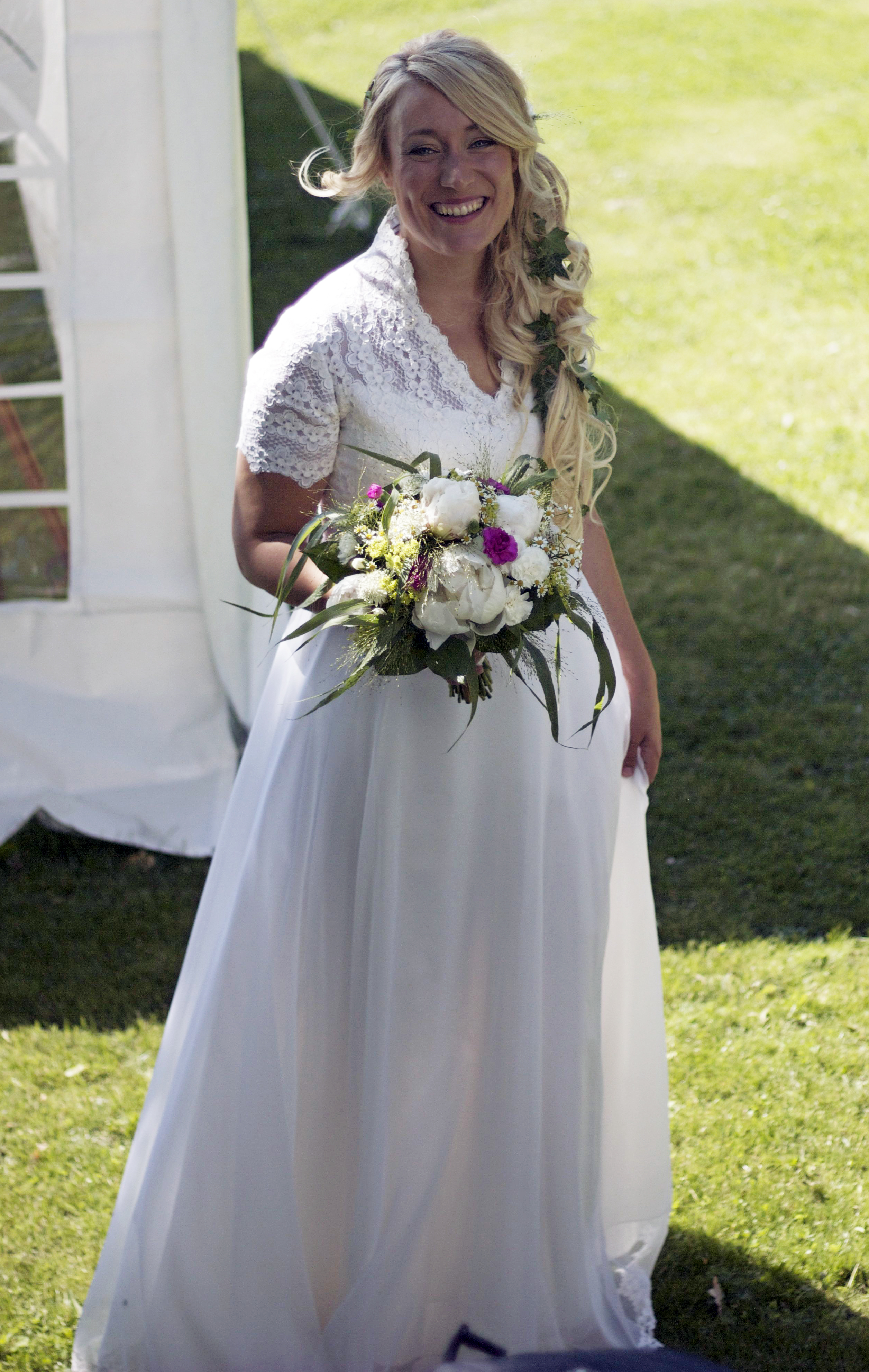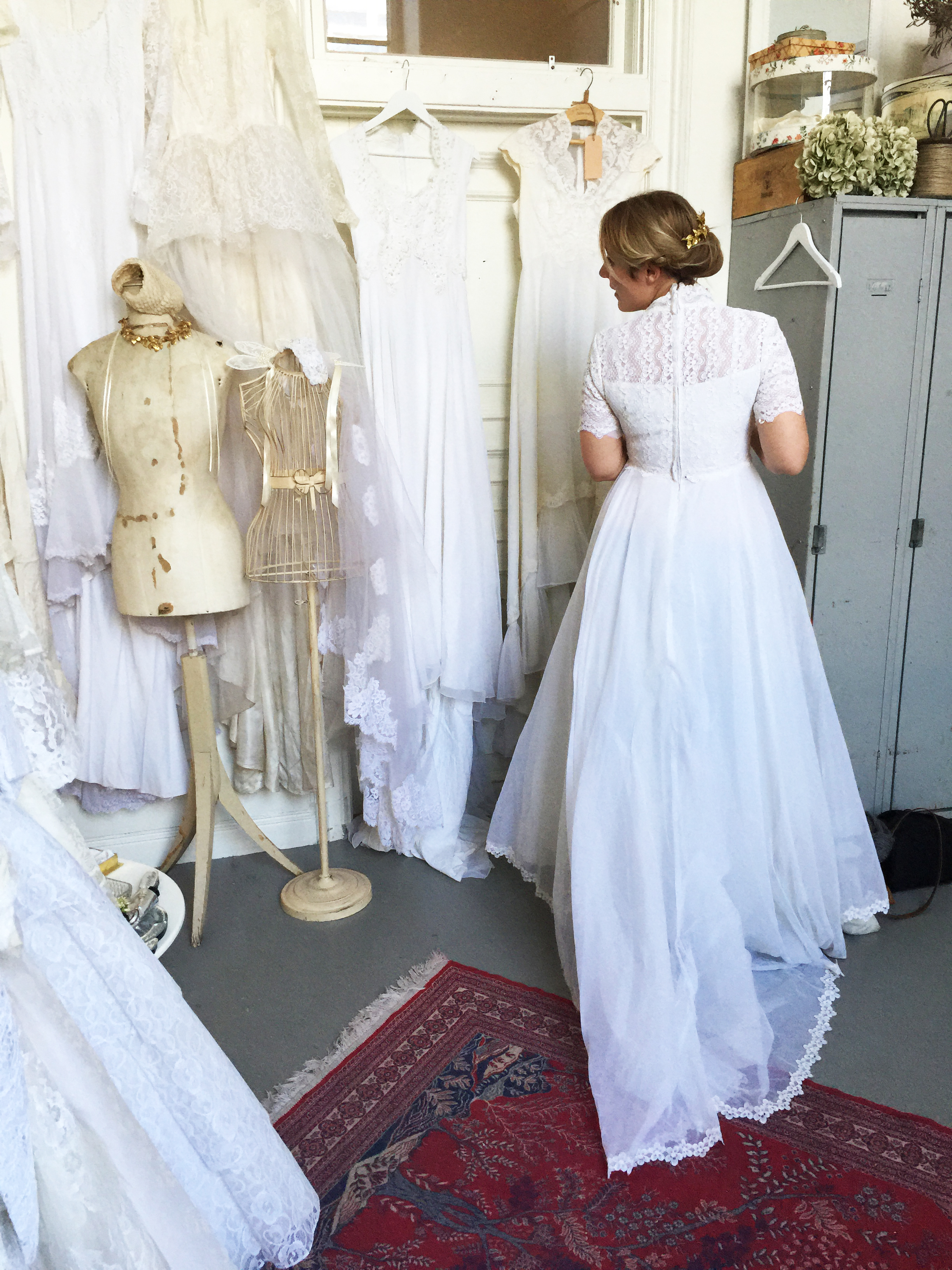 En vintagebrudklänning från 1950-talet i USA. Det var den första jag provade och jag tycker den satt som ett smäck. Dessutom gillade jag spetsen, den lilla kragen och att jag kände mig lite älvlik i den. Det är så roligt att tänka på alla som burit den innan mig och vad för kärlekshistorier de har att berätta.
