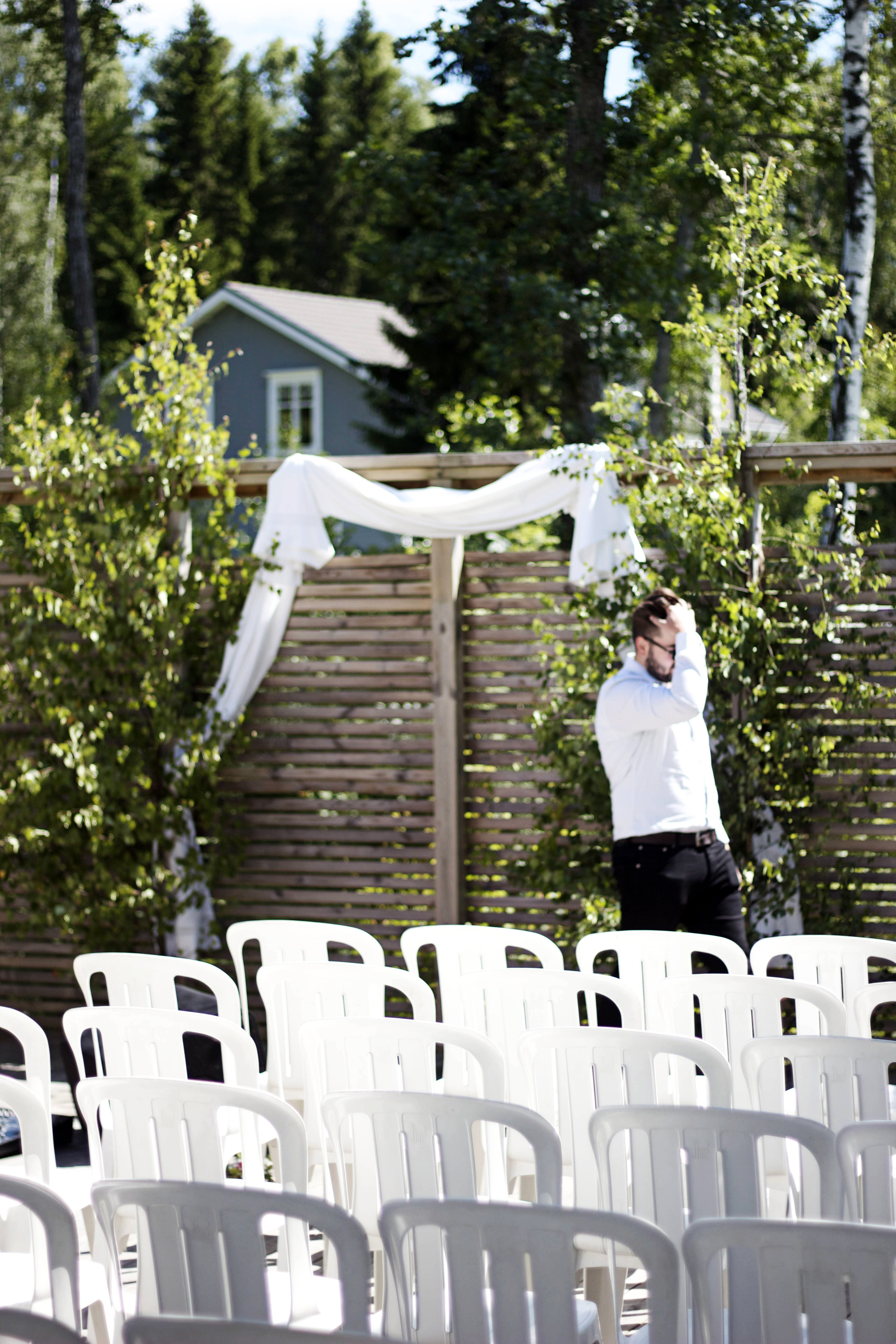 Michela, Bianca, Vendela och Linnea kom tidigt på lördagsmorgonen och fixade denna fina björkbåge på Åsas och Stefans terass dit vi hade flyttat vigseln efter varning för både storm och regn. Dagen innan hade pappa och spanjorerna huggit björkarna