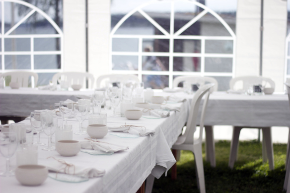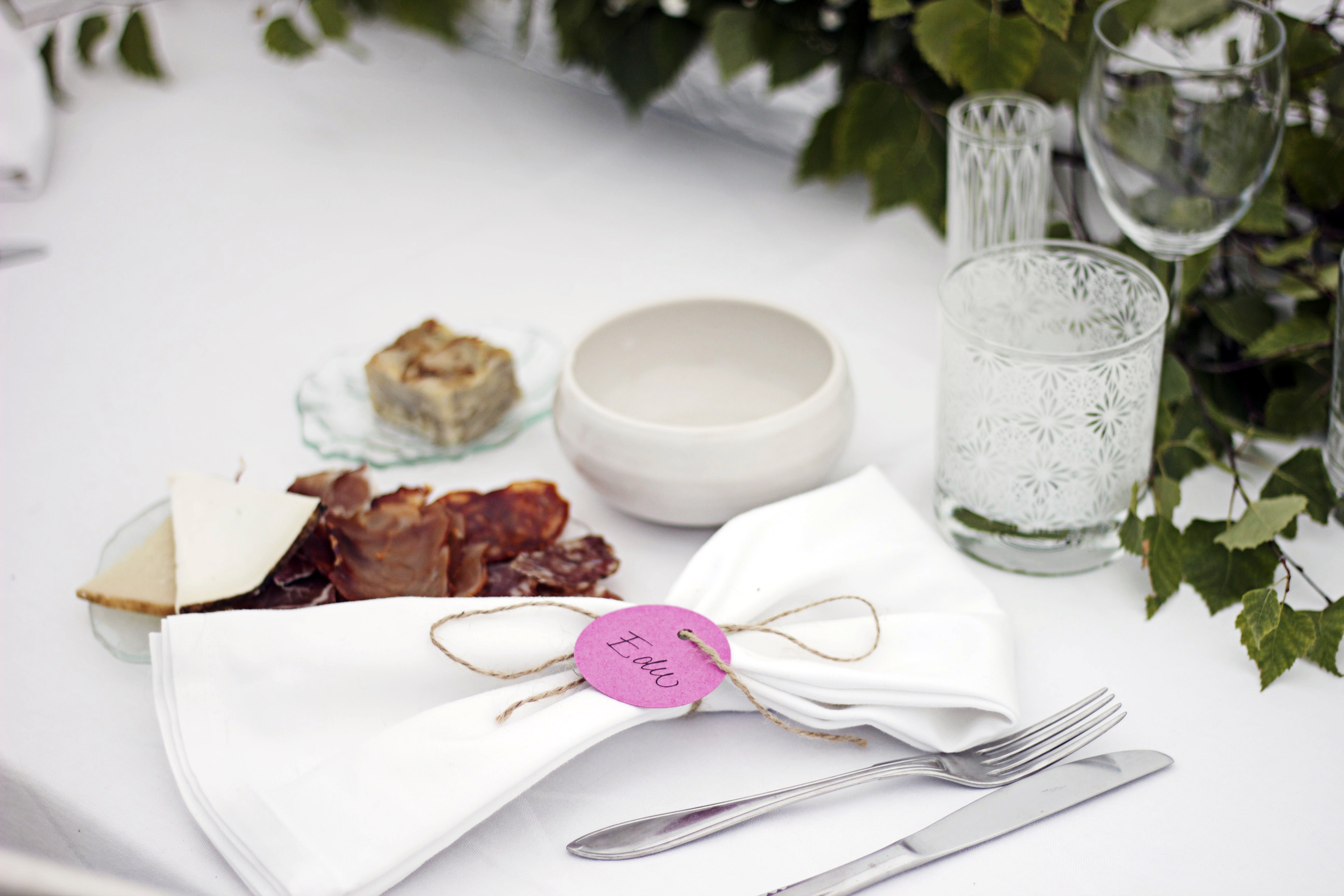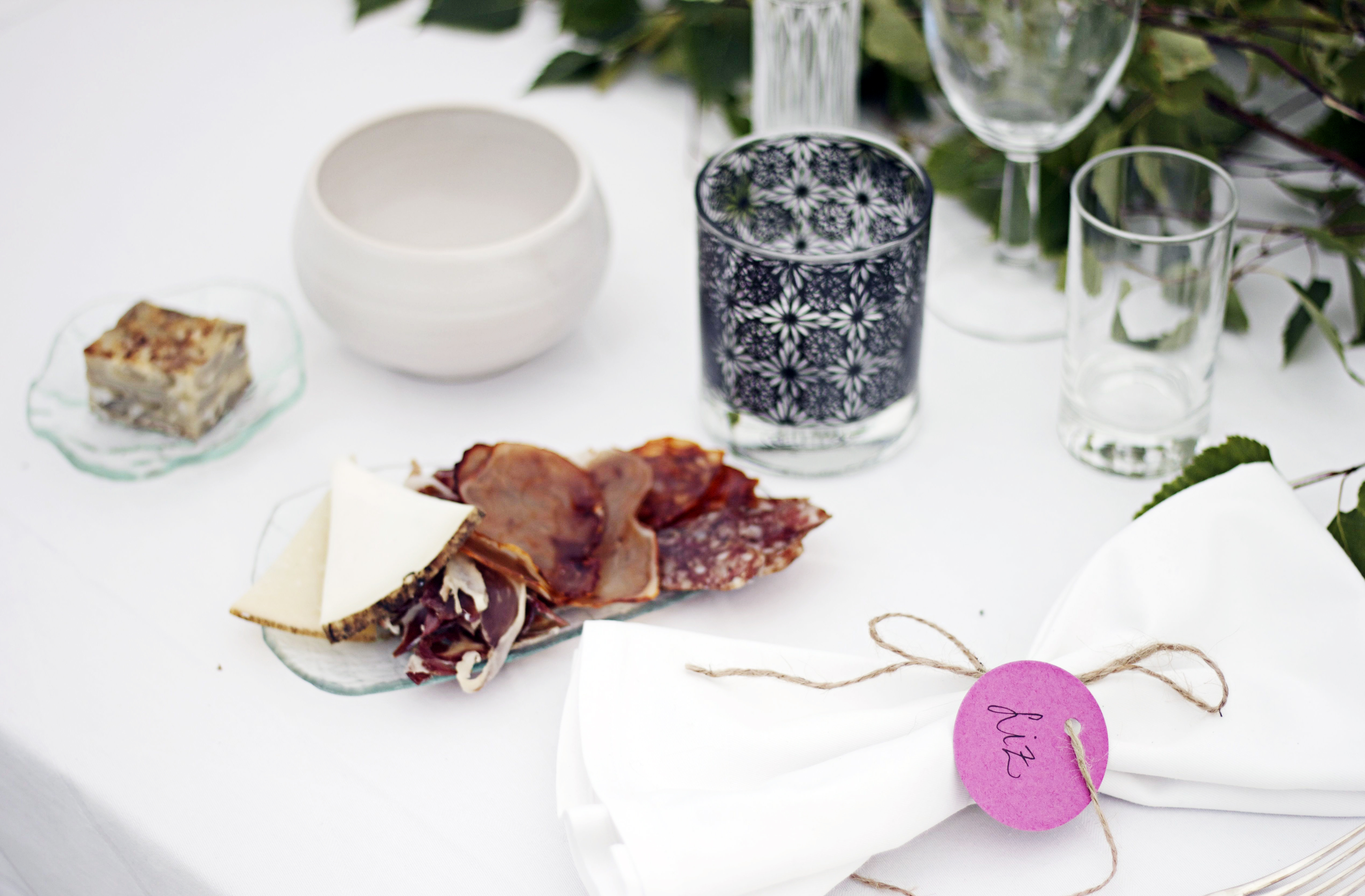 Flera månader innan bröllopet drömde jag mig bort på Pinterest och tänkte att jag skulle fynda allt porslin till middagen på loppis. Jag tycker det är så himla charmigt när man dukar med olika tallrikar, glas och bestick och ingen plats kring bordet ser likadant ut. Men det blev lite svårare än jag trott på grund av tidsbrist men då kom min fyndiga vän Anna på den goda idén att jag kunde höra med Harriet, om hon ville hyra ut sina loppisfyndade bestick till mig. Det visade sig att hon inte bara har fina bestick utan även jättefina glas, tallrikar och skålar av olika åländska designers. Harriet som är en fena på att laga mat, har aldrig hyrt ut dem till någon tidigare, men hoppade på idén och jag blev så himla glad. Allting passade nämligen perfekt till vår menyn. De fina glasfaten, som den duktiga keramikern Mia Englund gjort av gamla fönsterglas, använde vi till våra tapas. Skålarna, också av Mia, till cevichen och de vackra glasen av Minna Rundberg, blev superbra att servera gazpacho i. Resten av porslin, glas och annat som behövdes hyrde jag av Köksmeny. Jag ville nämligen ha vanliga vita tallrikar och klassiska glas som en bas eller grund till alltihopa. Så här blev det: