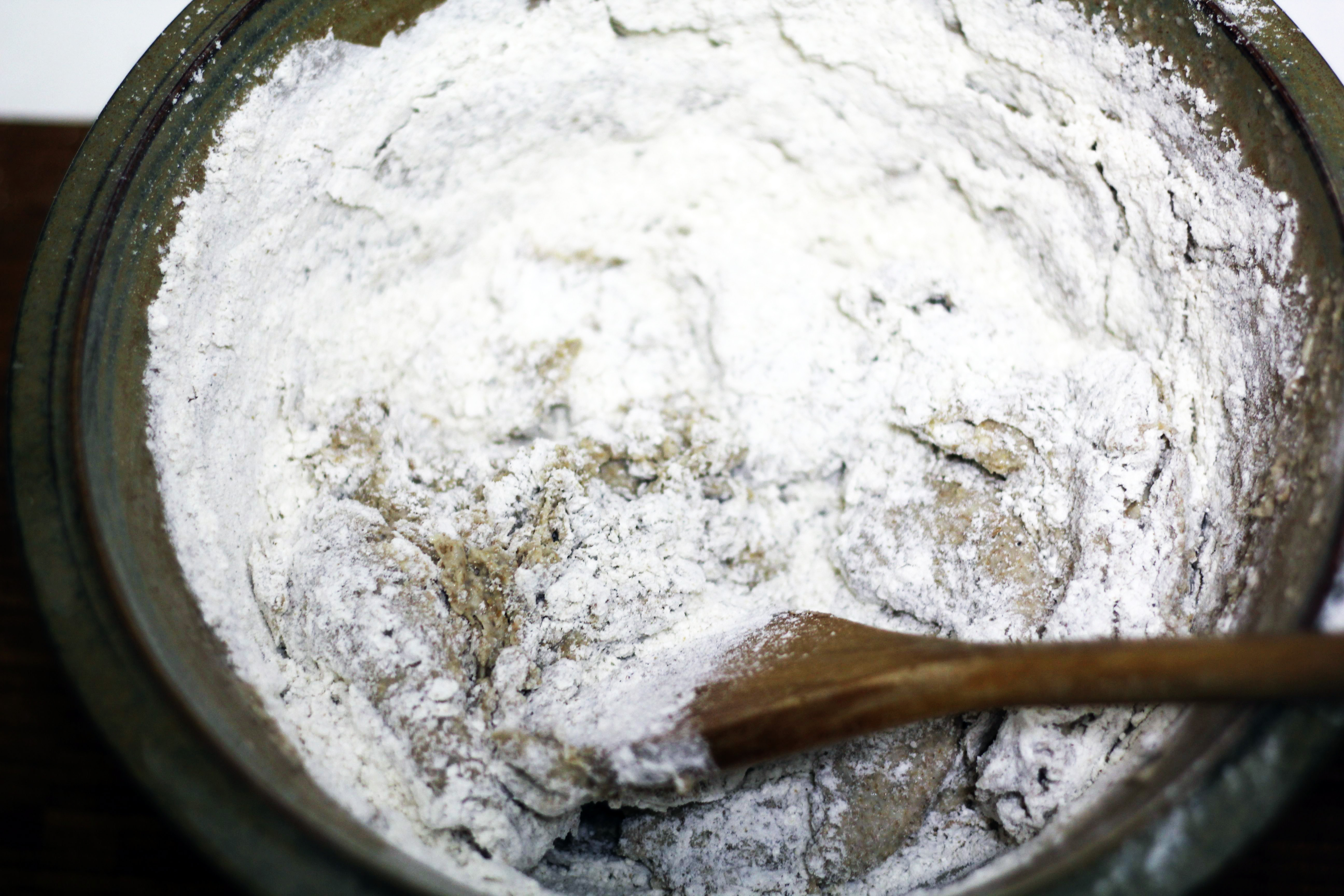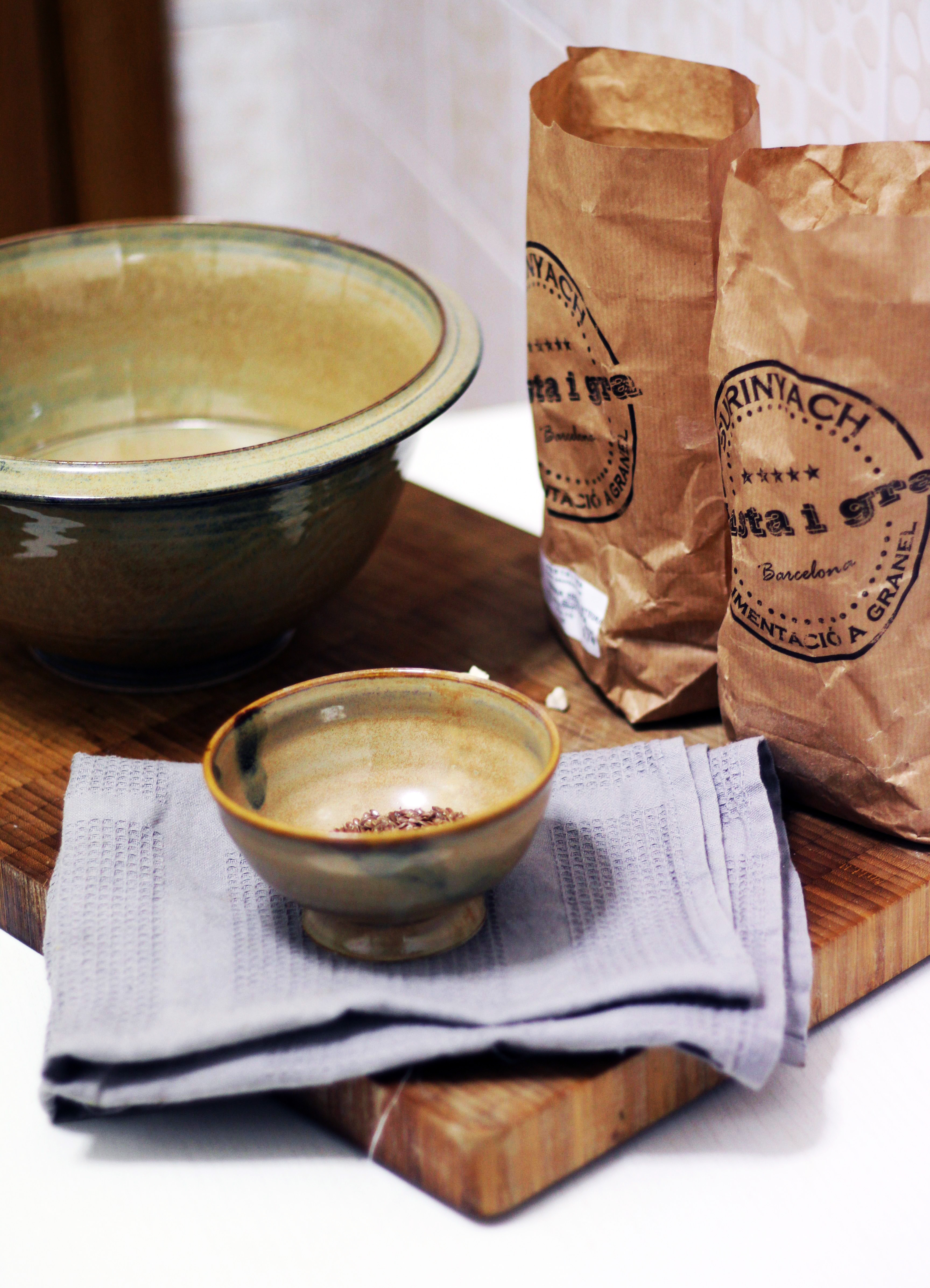 Rör ihop allt, i med linfrönen och knåda sedan i några minuter så att brödet blir luftigare.