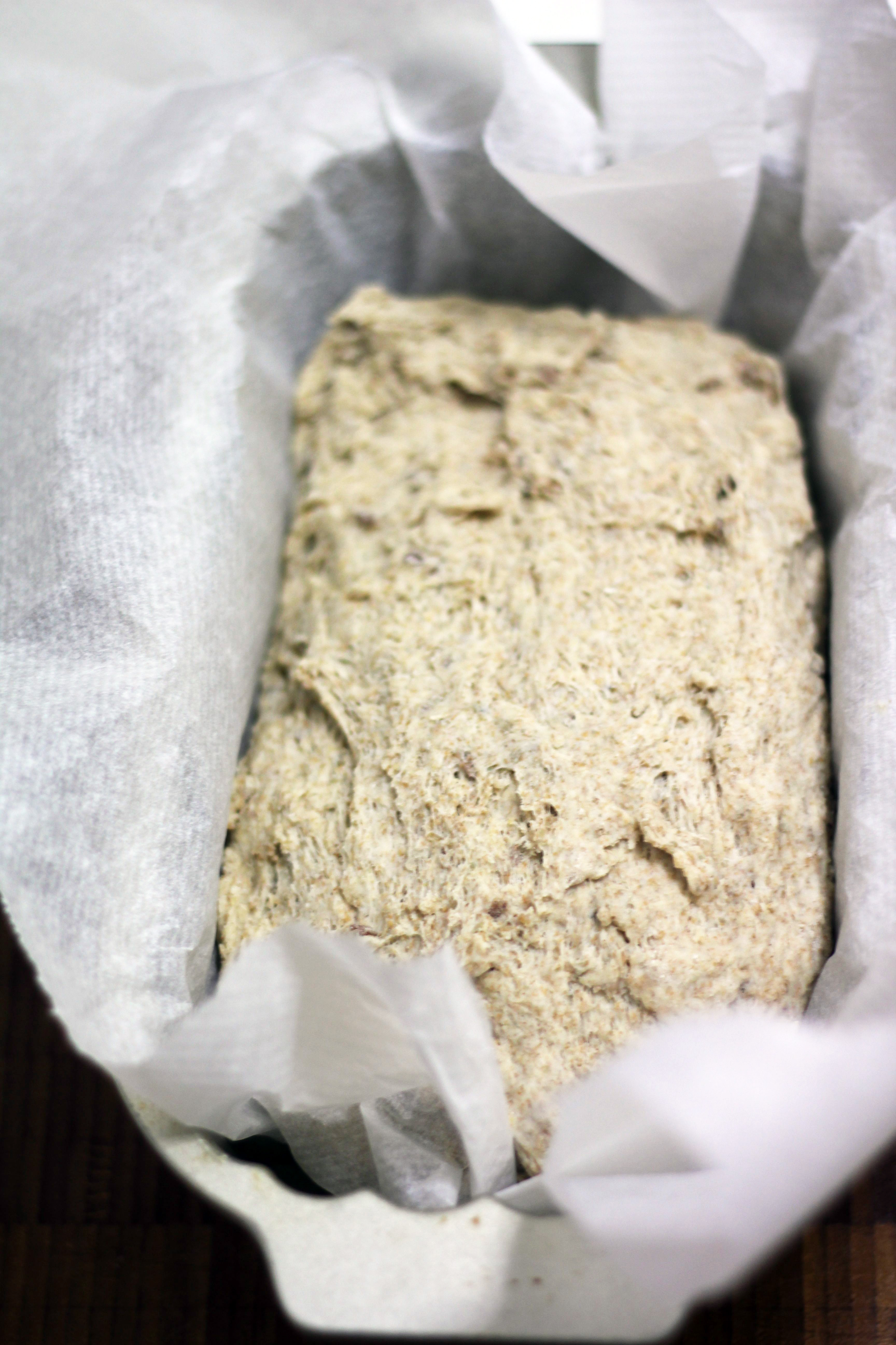 2. Forma degen till en limpa. Lägg den i en limpform, ca 1 ½ liter, klädd med bakplåtspapper.