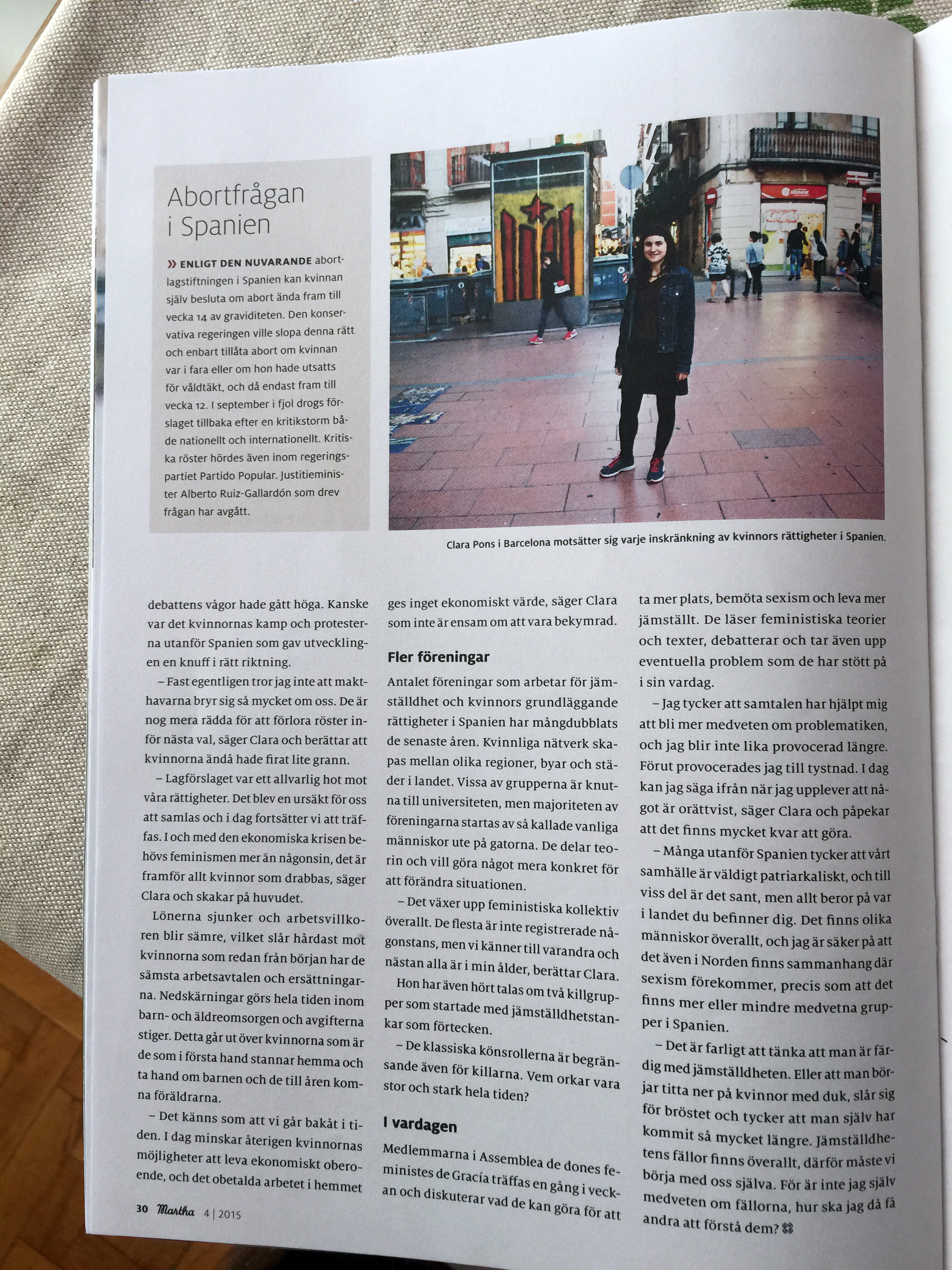 Jag har träfat Clara, en ung, politiskt aktiv feminist här i Barcelona, som bland annat kämpat för att regeringens förslag att förbjuda aborter inte ska gå igenom. När vi möts firar hon och de andra medlemmarna i Assemblea de Dones feministes de Gracia. De hade just fått reda på att lagförslaget kastats.