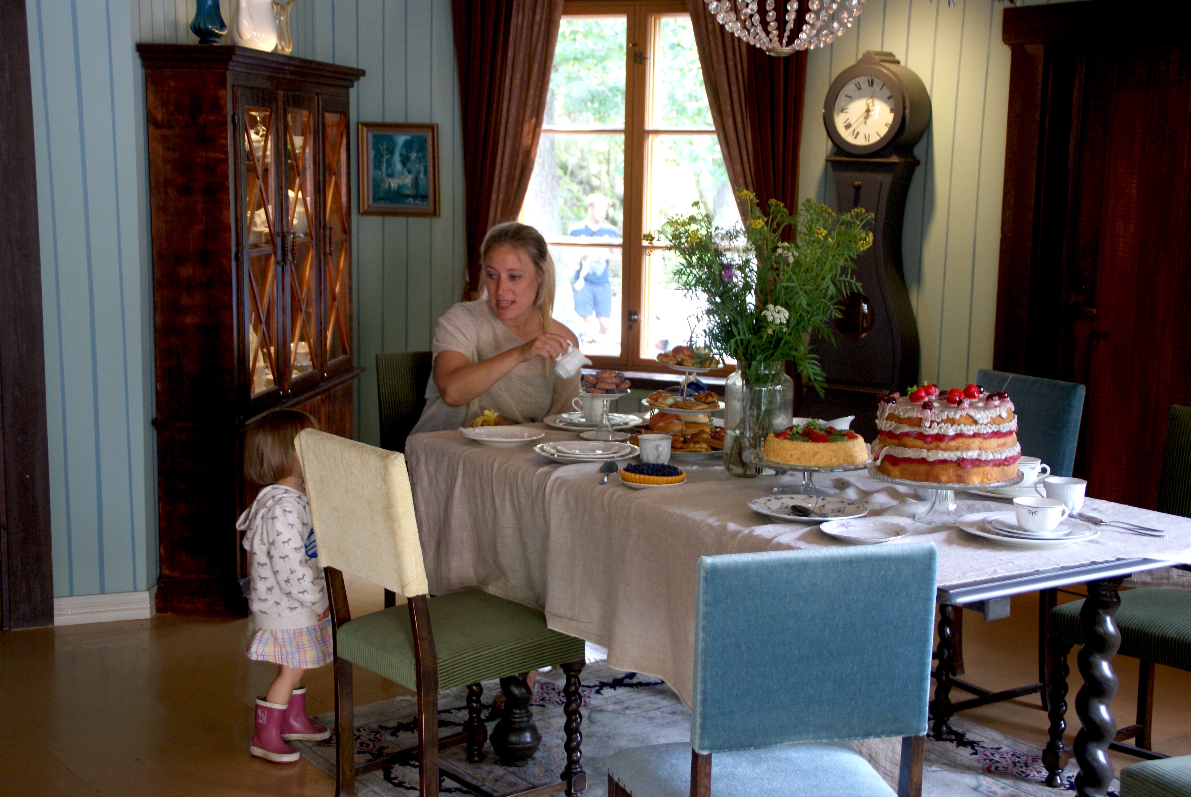 Dricka kaffe och äta låtsastårta vid Muminfamiljens matbord,