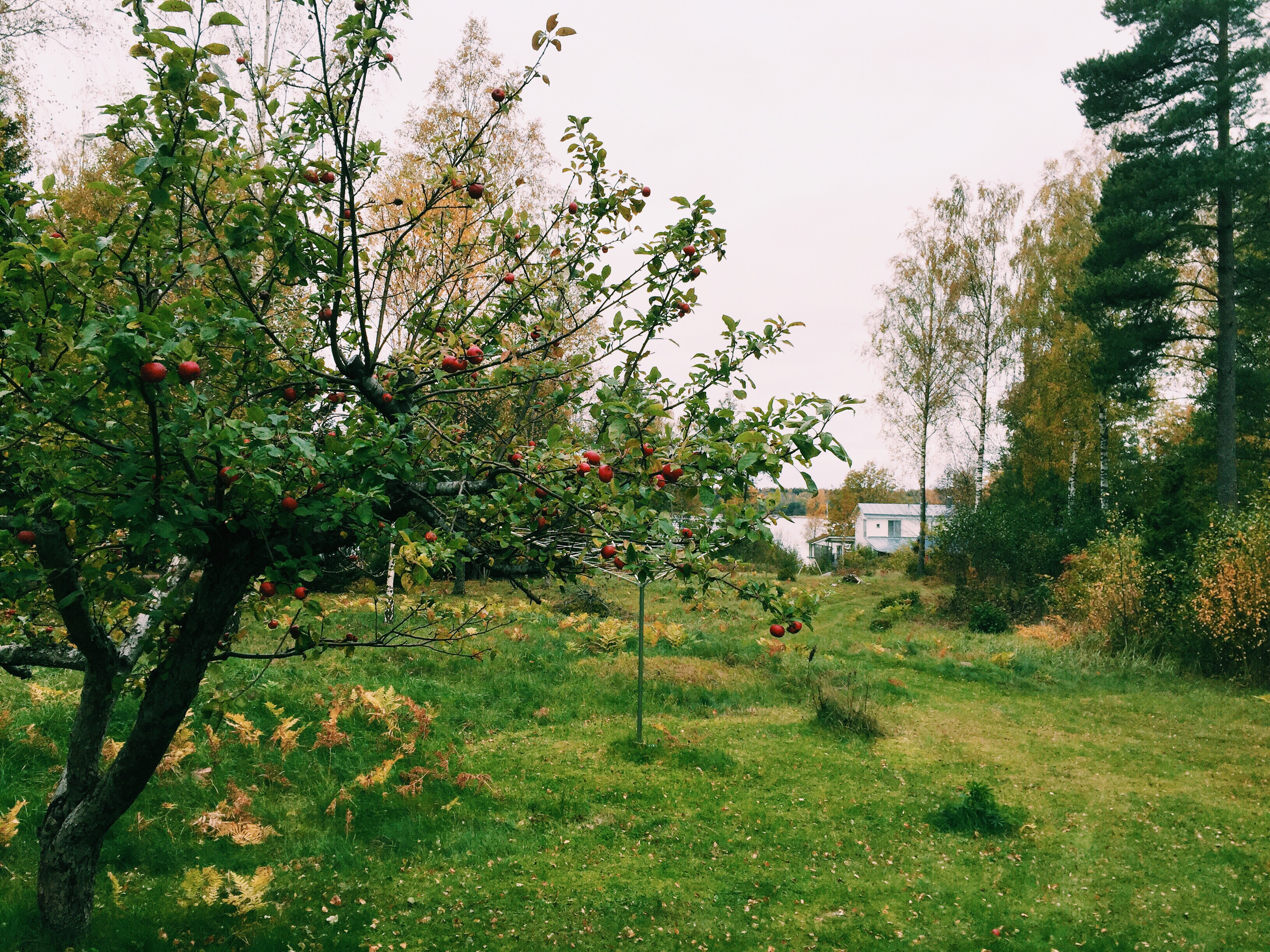 Jag står en stund och tittar på äppelträden, kontrasten mellan de gröna gräset och de gula löven på marken och vattnet som ligger helt plattlugnt nere vid sjön.
