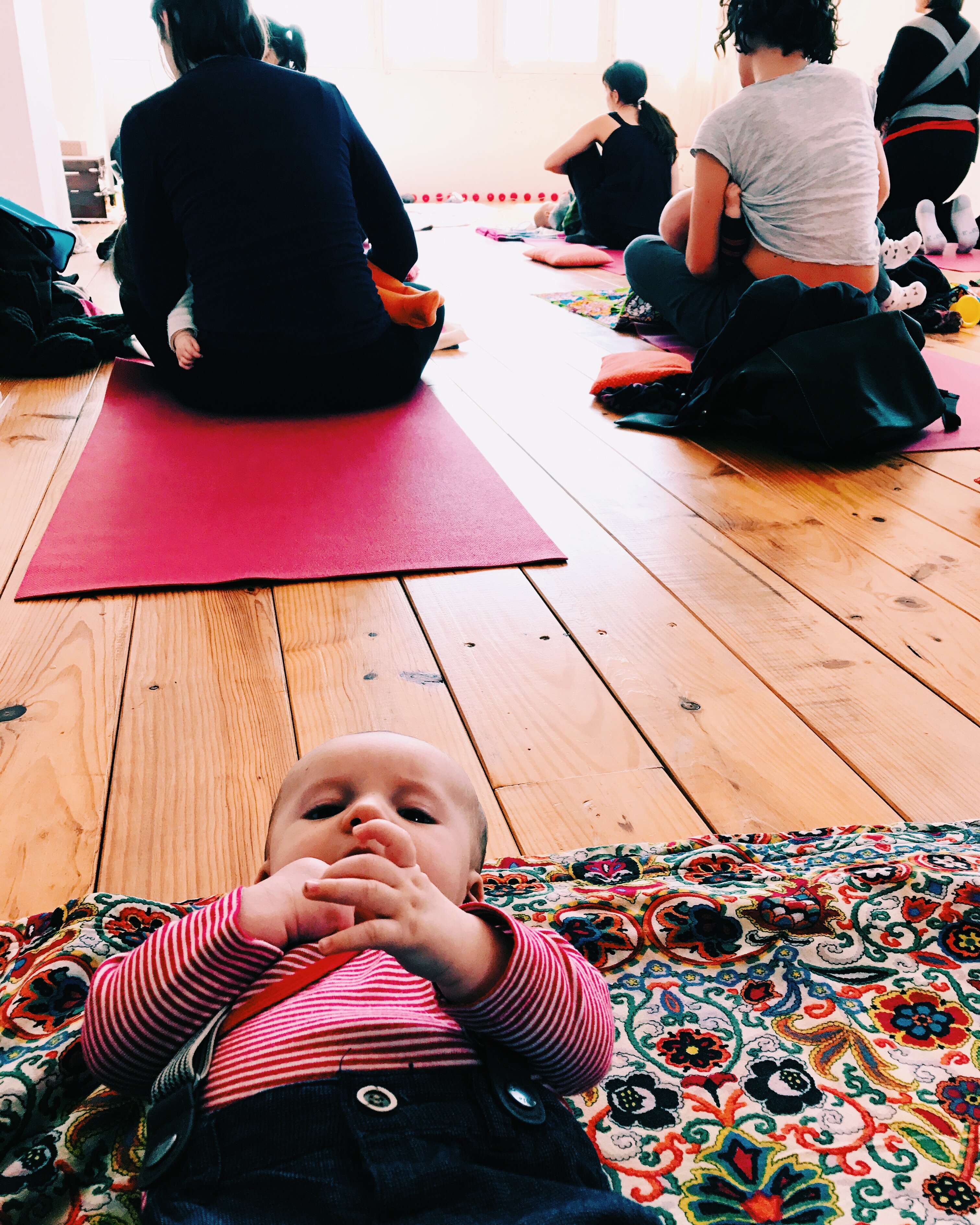 Efter besöket gick jag ner en trappa till mitt yogaställe. Dit har jag inte heller varit sedan i november och det var så roligt att träffa de andra gravida som också fått barn. Hjalmar stortrivdes på mamma/baby-yogan och jag fick ett sådant skönt lugn inuti.
