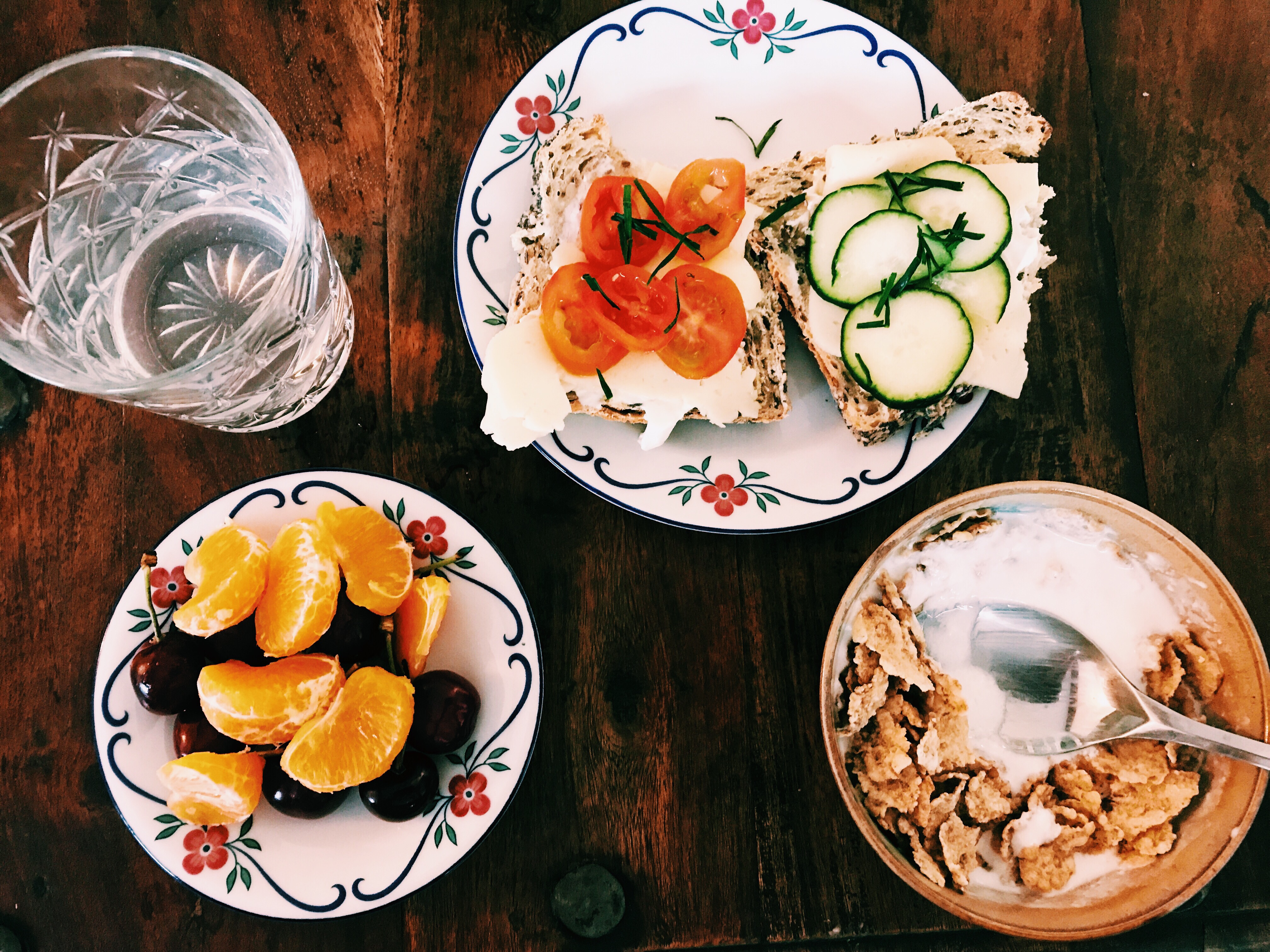 Jag började dagen med en riktigt lyxfrukot med körsbär, mandariner och ostmackor med gurka och tomat och gräslök på.