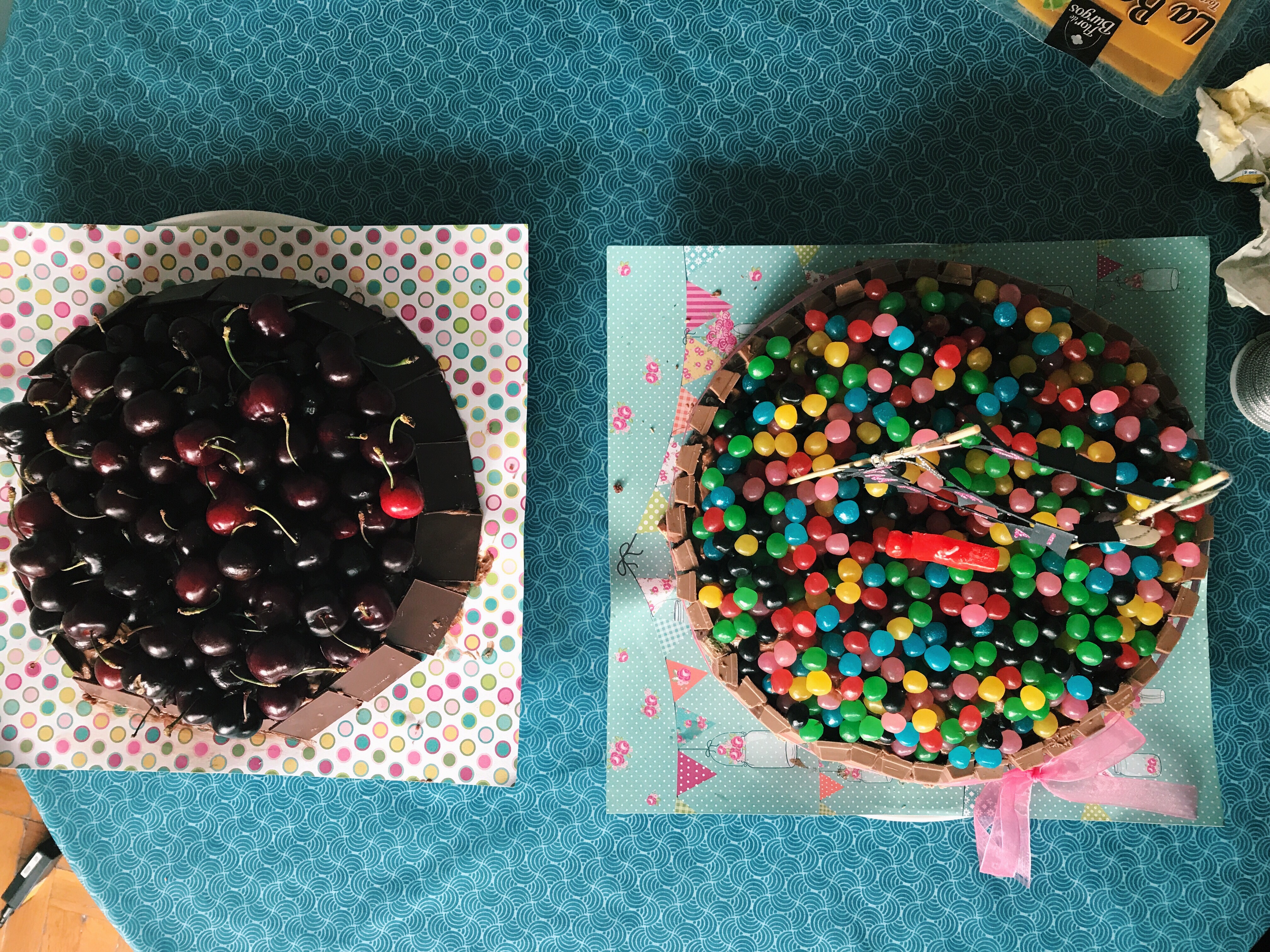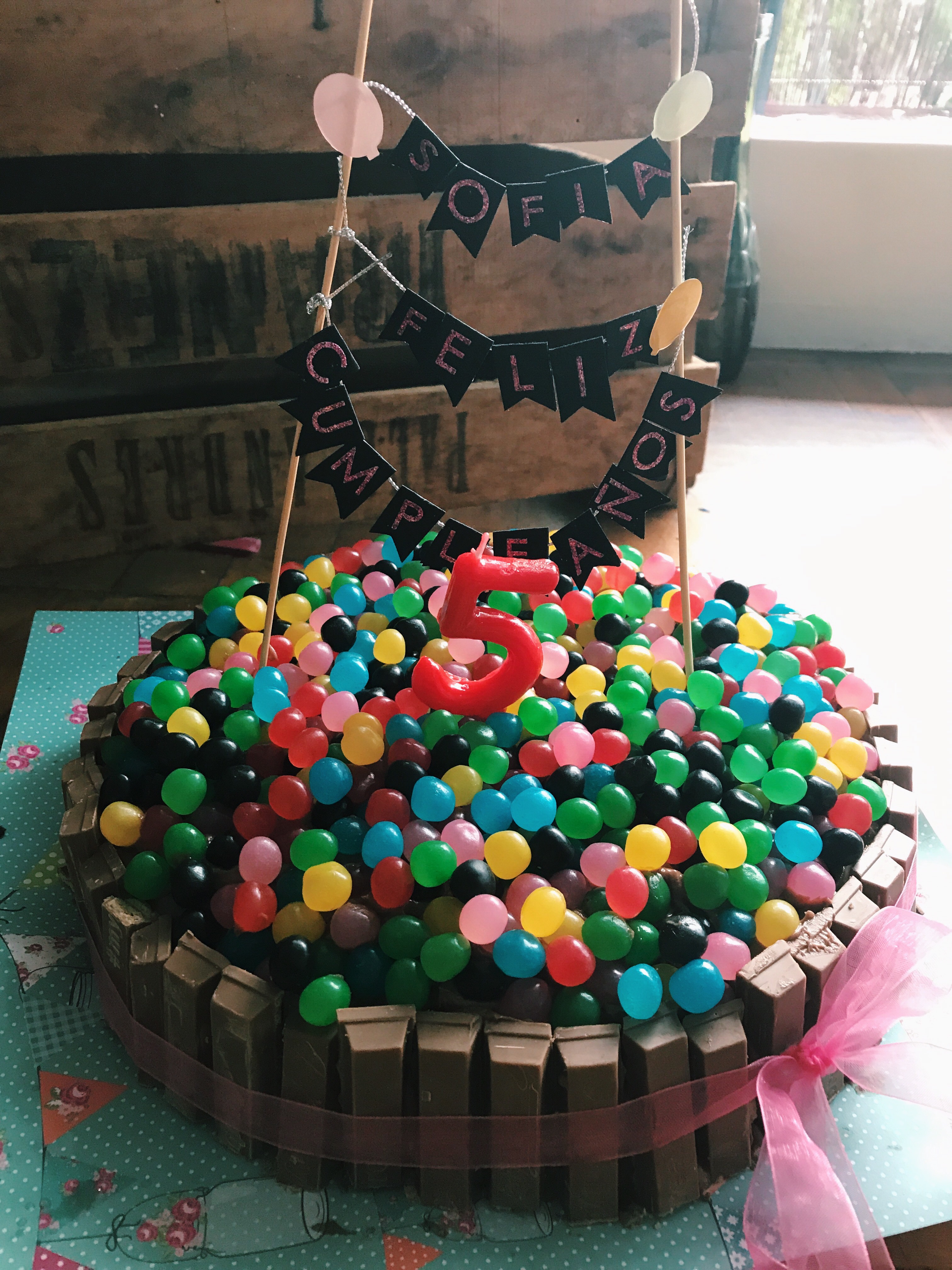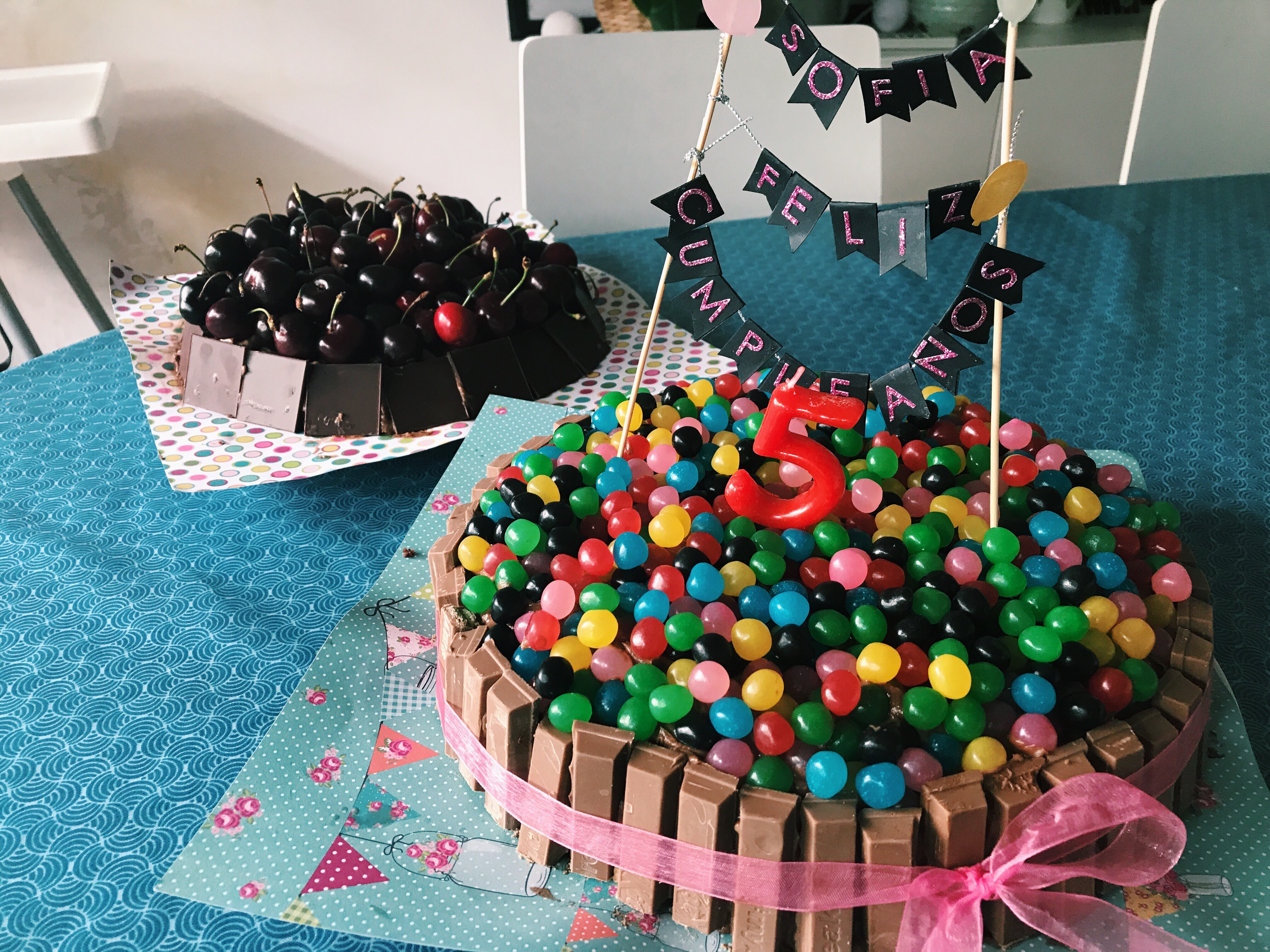 En som fick bli huvudtårtan som jag dekorerade med kit-kat och massor med färgglada godisar och sen knöt en rosett kring. Sedan klippte jag ut små vimplar och limmade på glittriga bokstäver och skrev på spanska ”Grattis på födelsedagen Sofia”.