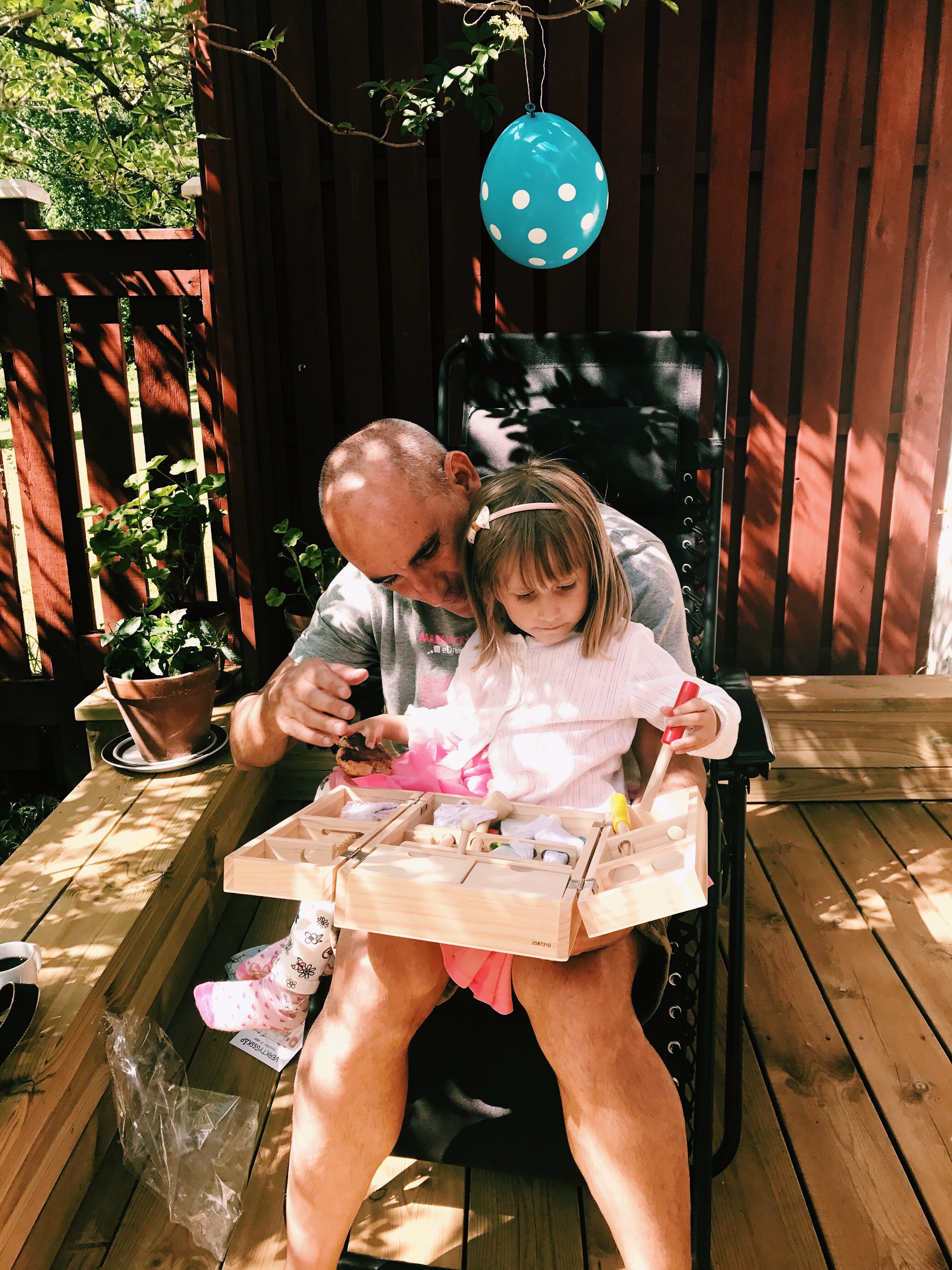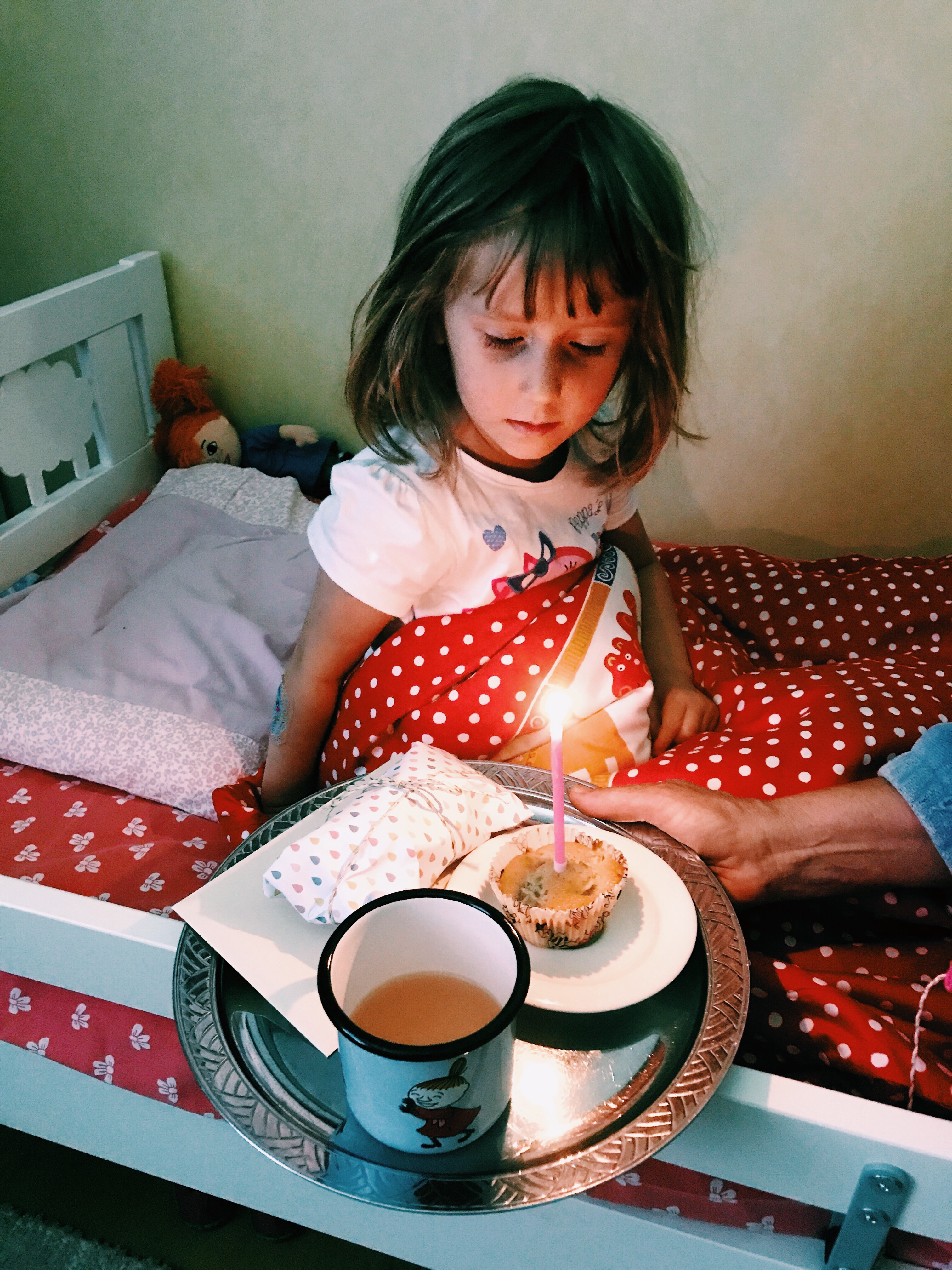 Vi började med frukost på säng såklart och sång av mormor, morfar och jag. Juni älskar ”Lotta på Bråkmakargatan” så hon gjorde precis som Lotta och låtsades sova när vi kom in.