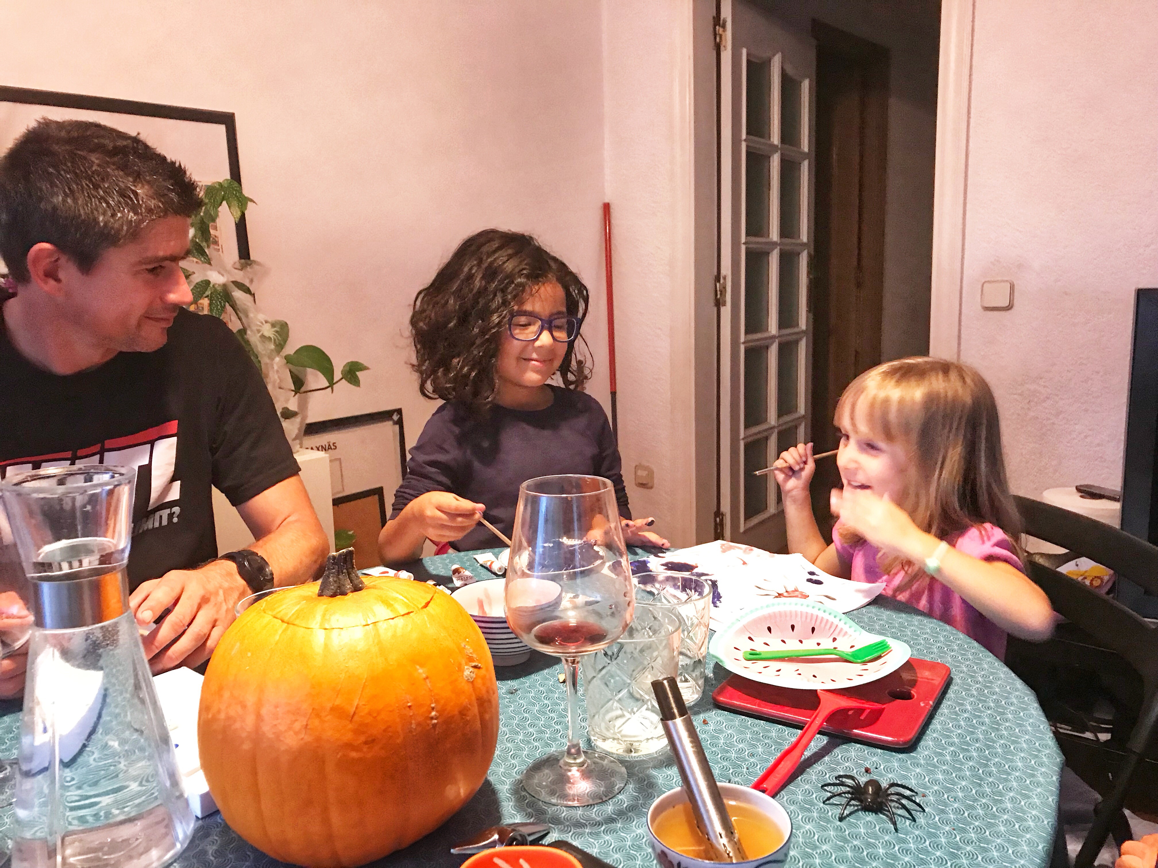 och lagat pumpasoppa med ögon till förrätt och chokladkaka med spindlar till efterrätt.