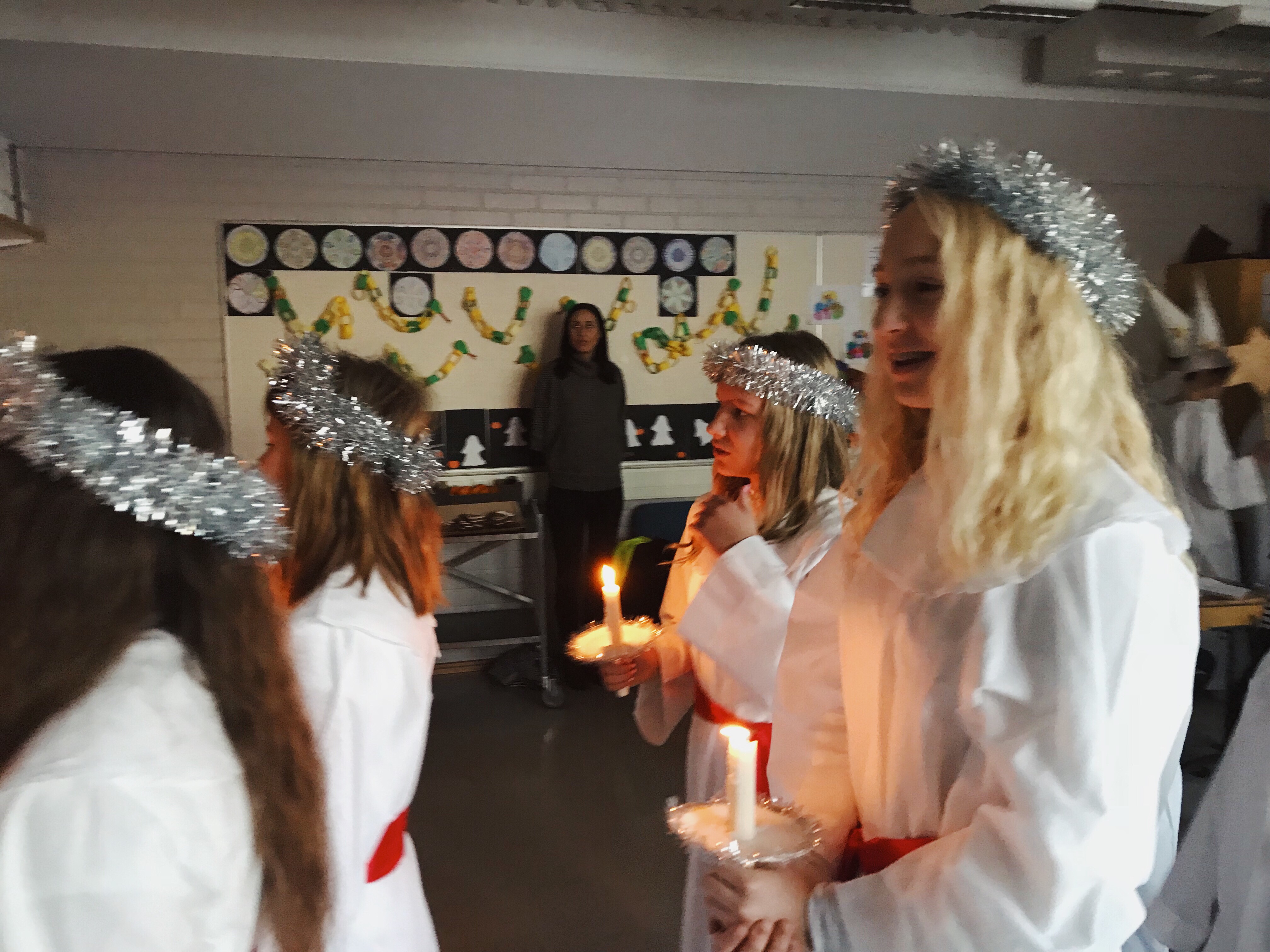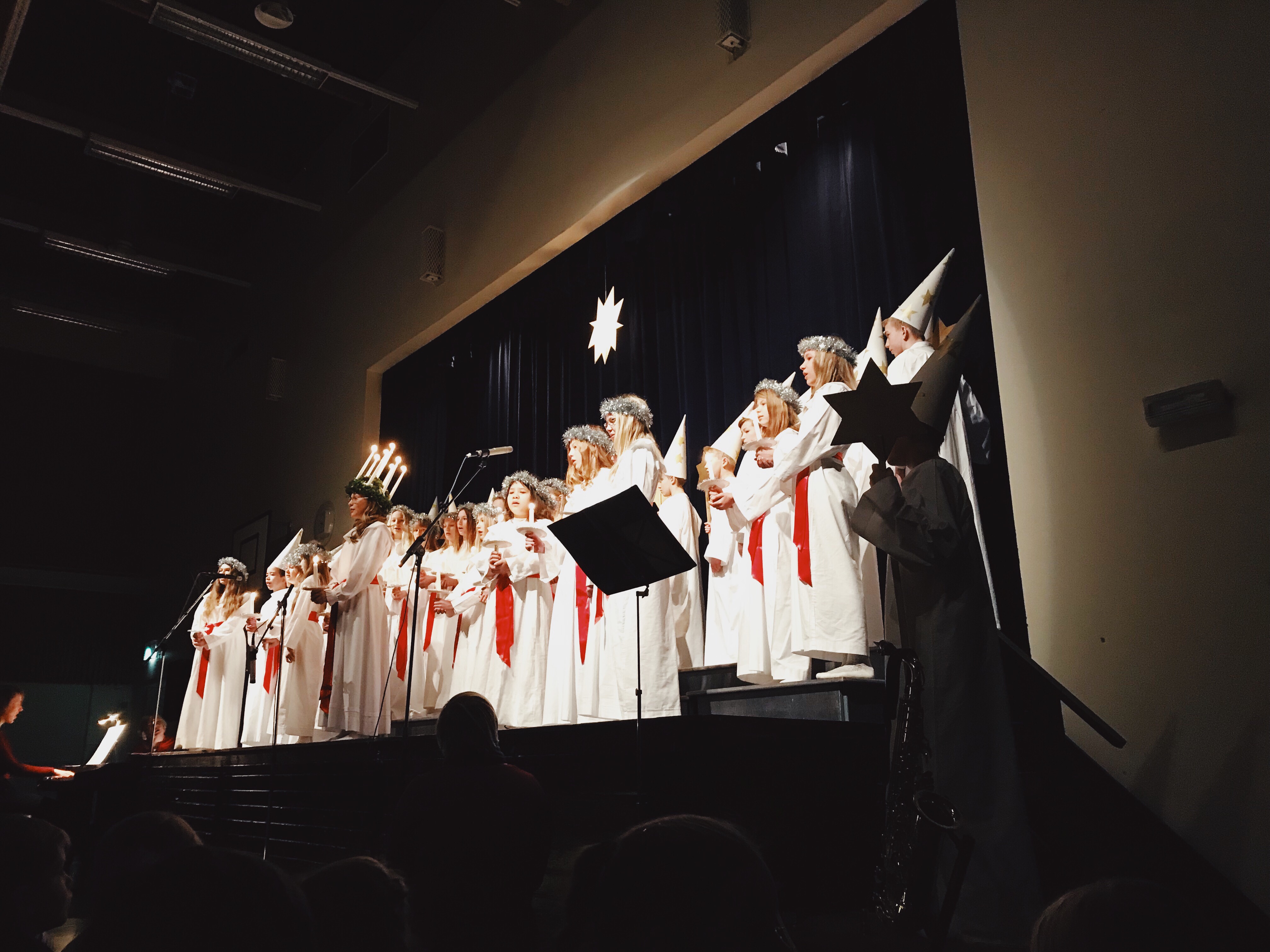 Det var så mysigt att vakna i onsdags och inse att det var luciamorgon. Jag väckte Juni och sen åt vi frukost ganska snabbt innan hon och jag och mamma packade in oss i bilen och körde till Vikingaåsens skola.