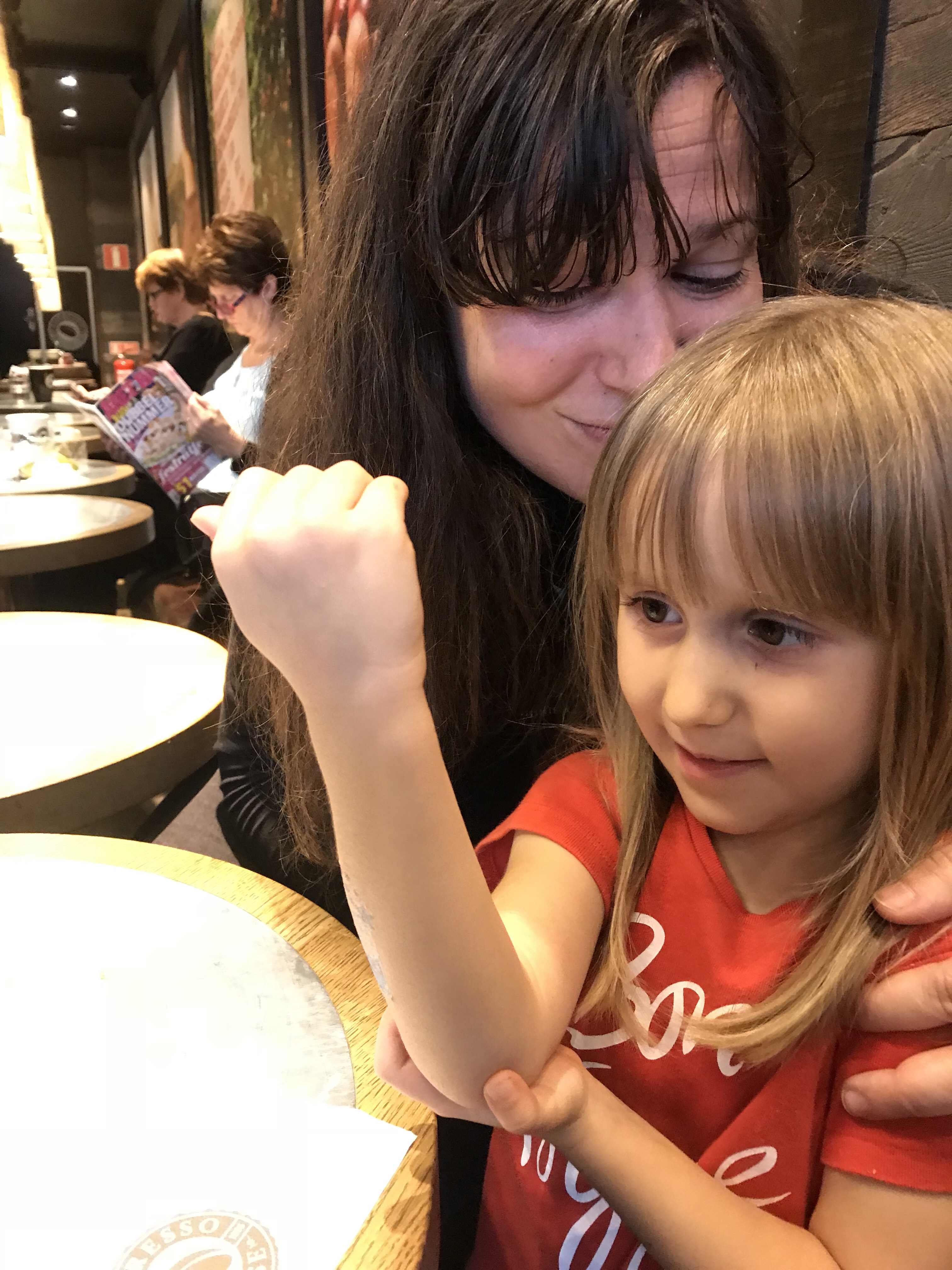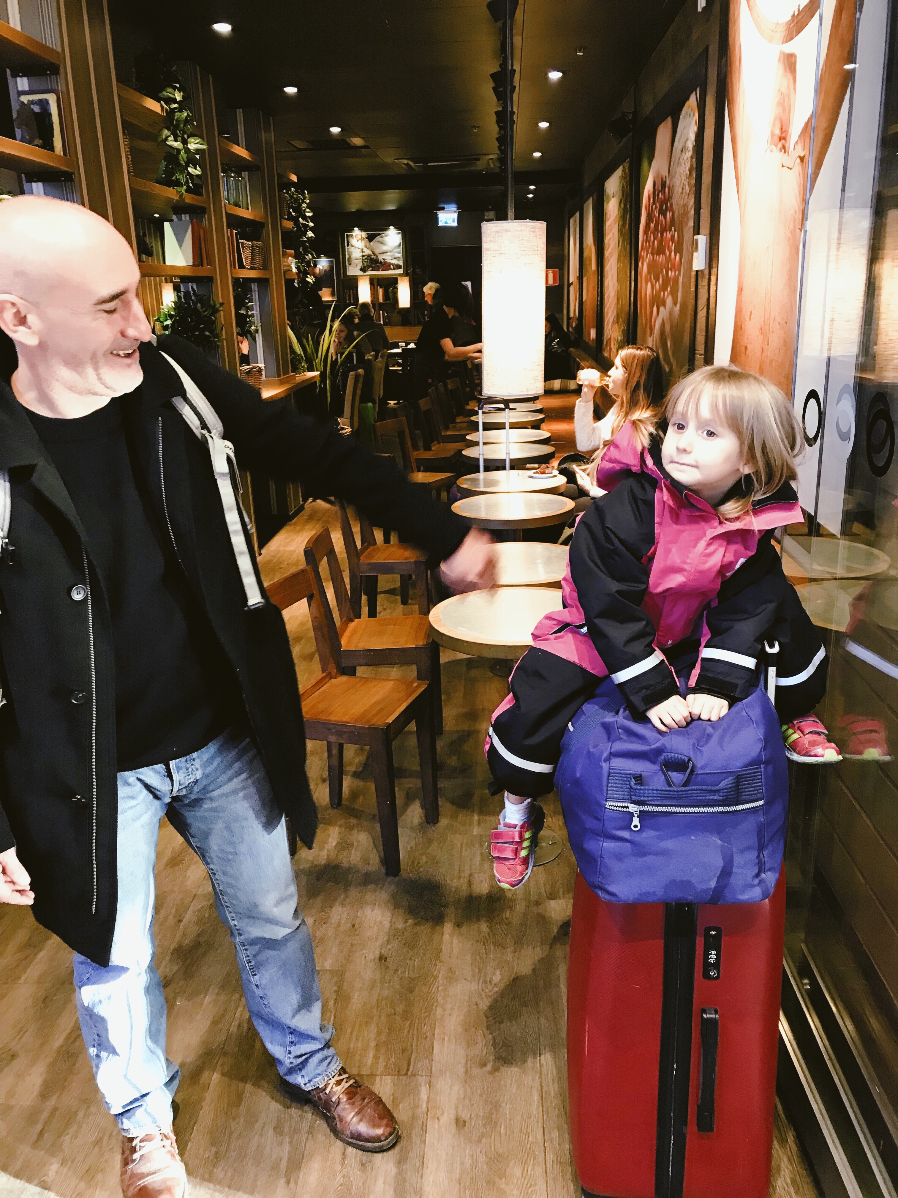 Här hade vi tagit oss till Stockholm och slagit oss ner på Espresso house på Cityterminalen för en liten paus. Vår au-pair Hanna var också med. Sådan lyx för mig, som brukar resa ensam, att vara tre personer på två barn!