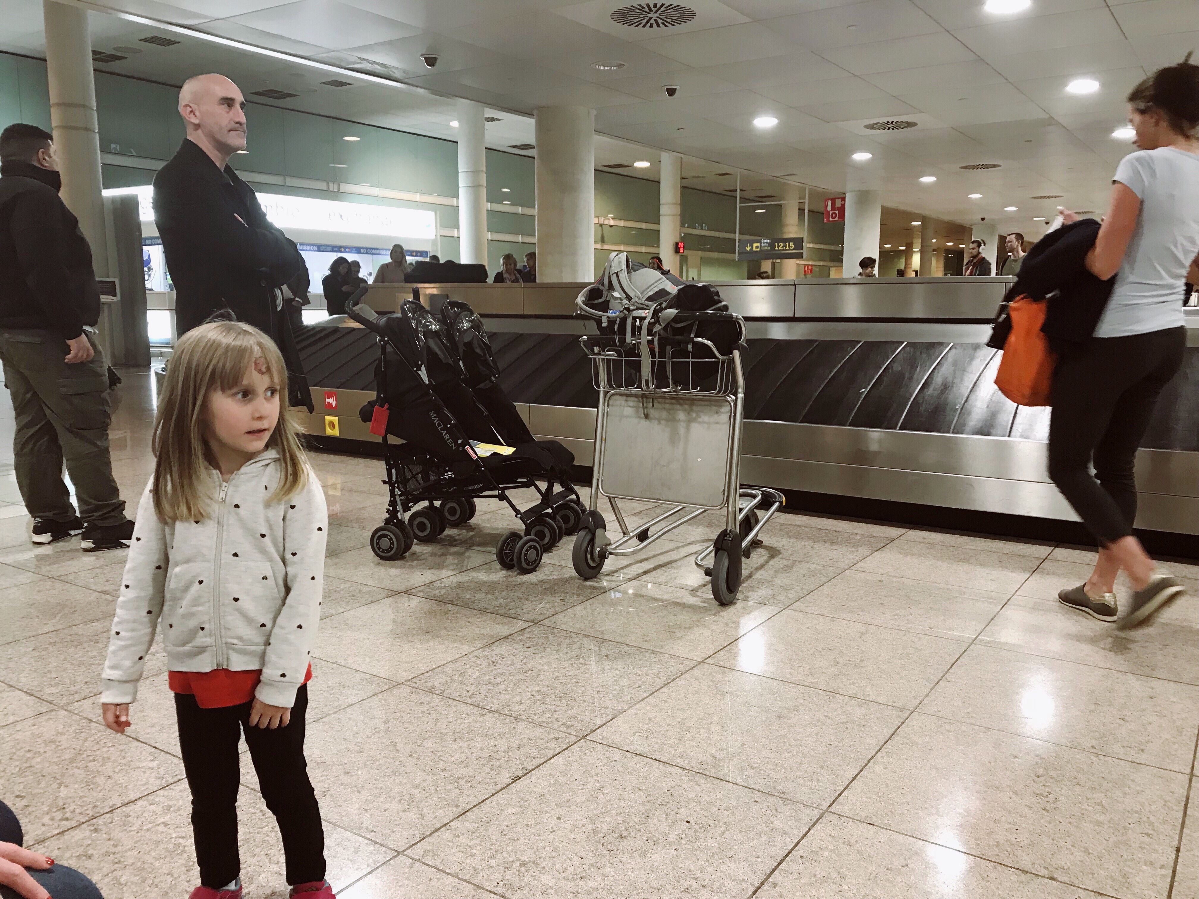 I Barcelona tar det ofta ganska lång tid innan bagaget kommer, speciellt eftersom vagnen ofta kommer till ett annat band som specialbagage. Men vid det här laget är jag bara så lycklig över att ha landat och vara välbehållen att jag har överseende med det mesta. Här igen var det också så enkelt när vi var tre. Edu lyfte bagaget från vagnen, jag bar på Hjalmar och vaktade väskorna och Hanna sprang på toa med Juni. Det är när jag är ensam och ska göra alla tre grejer på samma gång som de är klurigare.