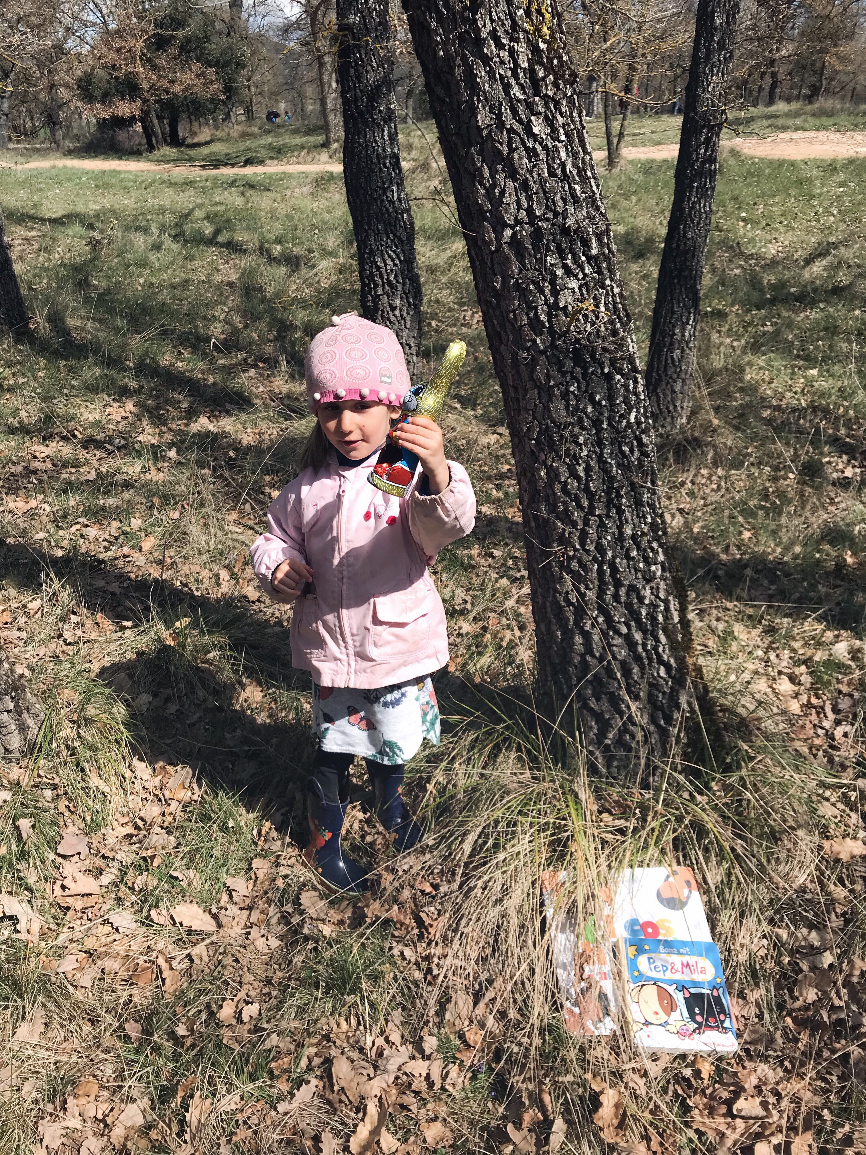 Så här gick det till: Jag ”påskharen” gick iväg en stund på en promenad och gömde ägg och ritade små ledtrådar på lappar. 🐥