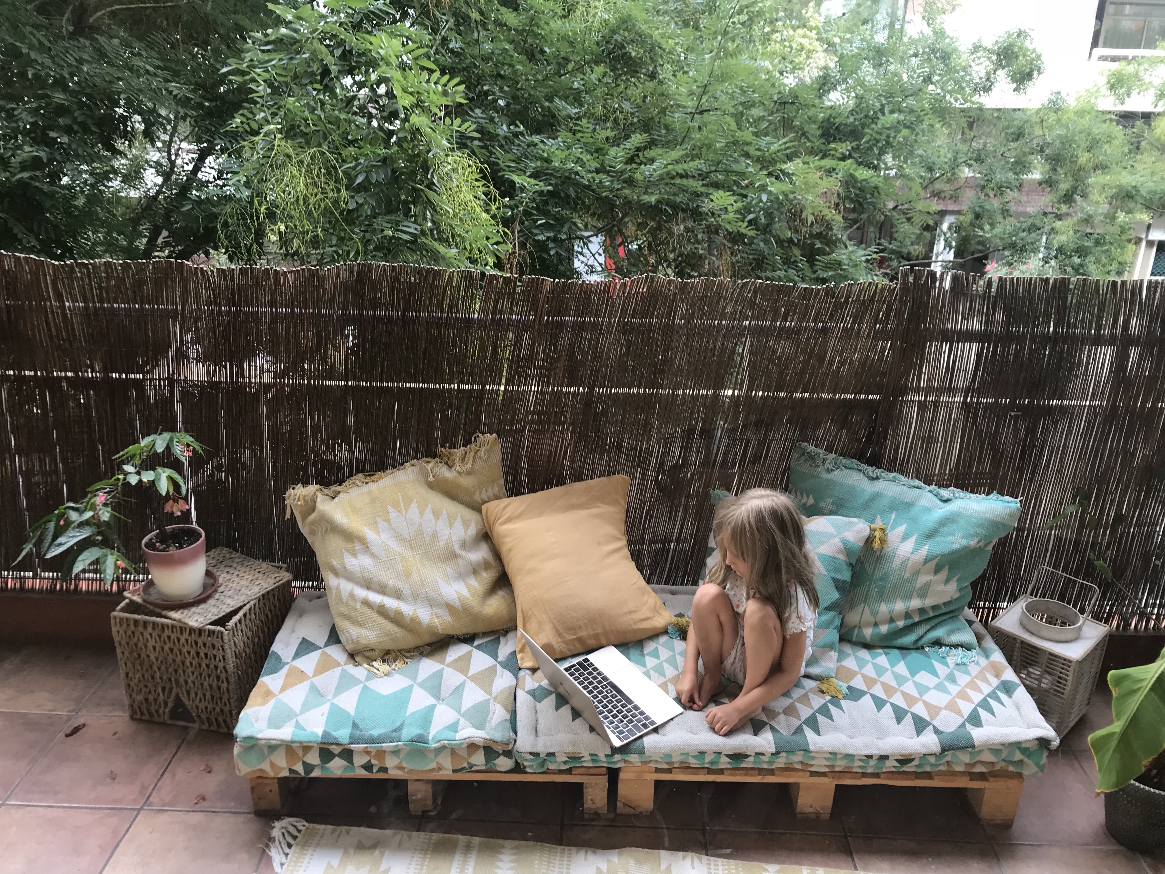 Lite blommor behövs för de flesta andra blommor har dött i värmen på vår balkong. Men det är ändå mysigt och grönt där ute med all grönska runt omkring. Juni tycker om att sitta där ute och se på film.