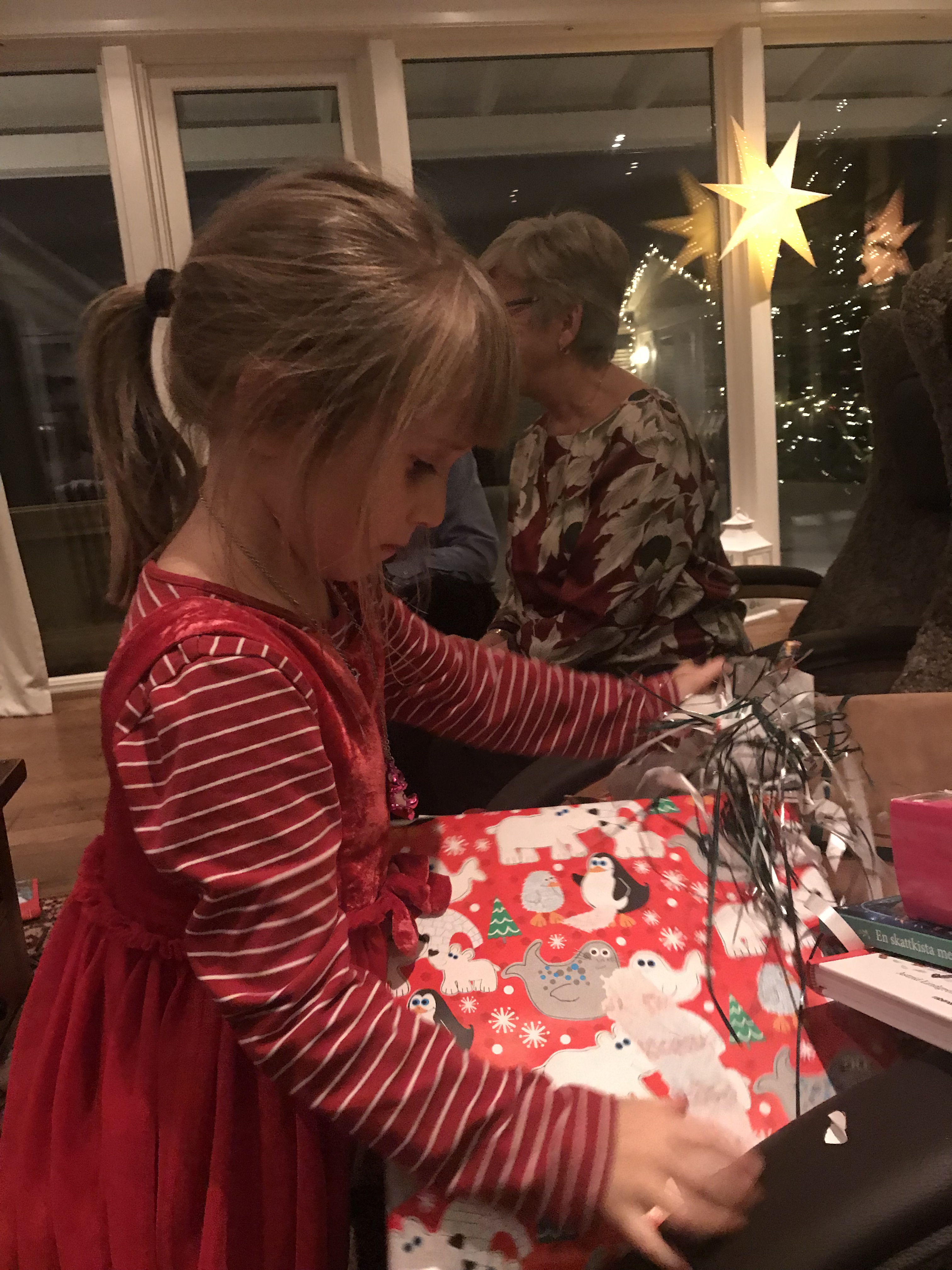 Julafton var fin. Jag vaknade 06.20 av Juni och Hjalmar. Vi gick upp. Det var alldeles kolsvart ute och jag tände till en början bara julgranen så att vi kunde njuta av enbart ljusen från den.