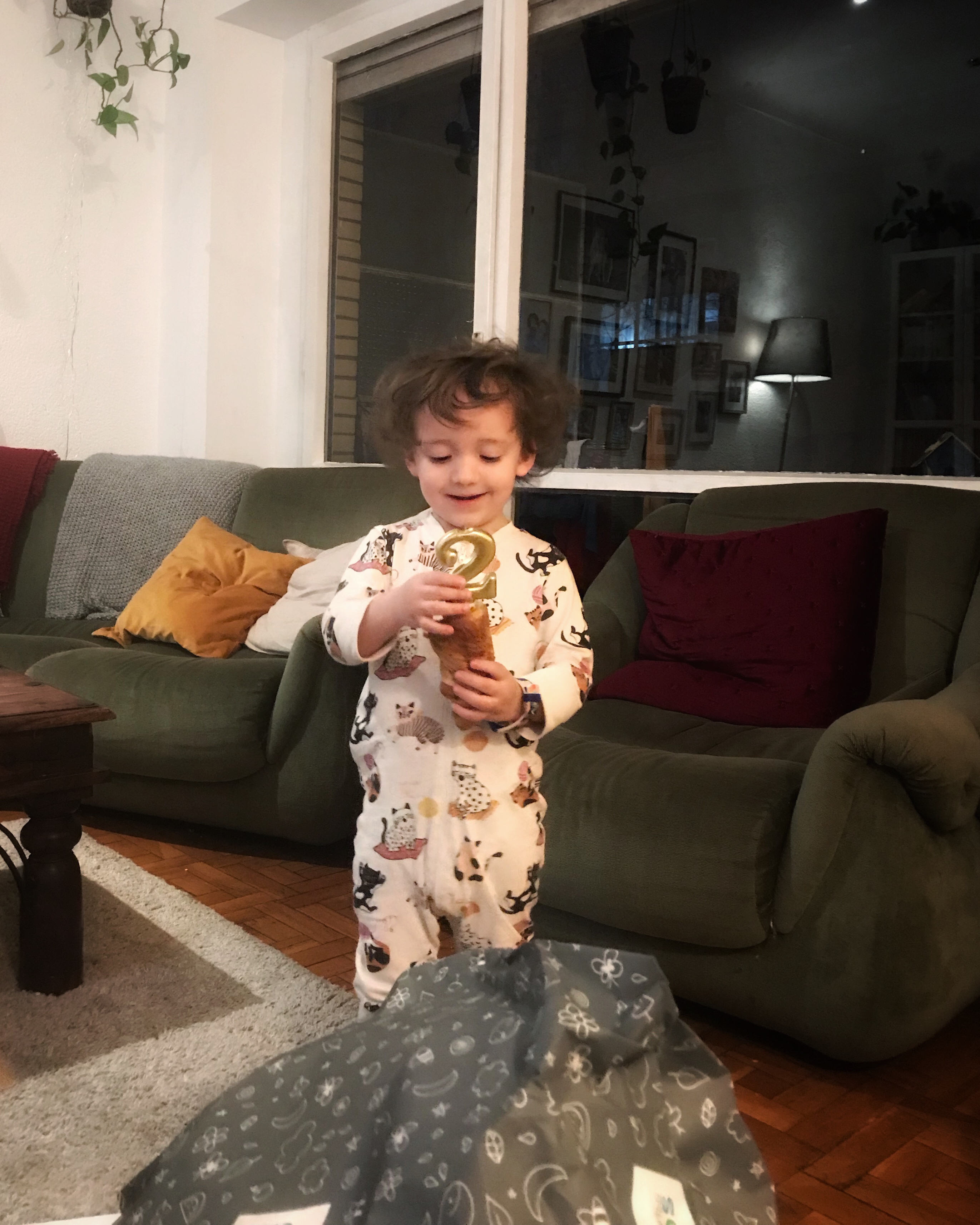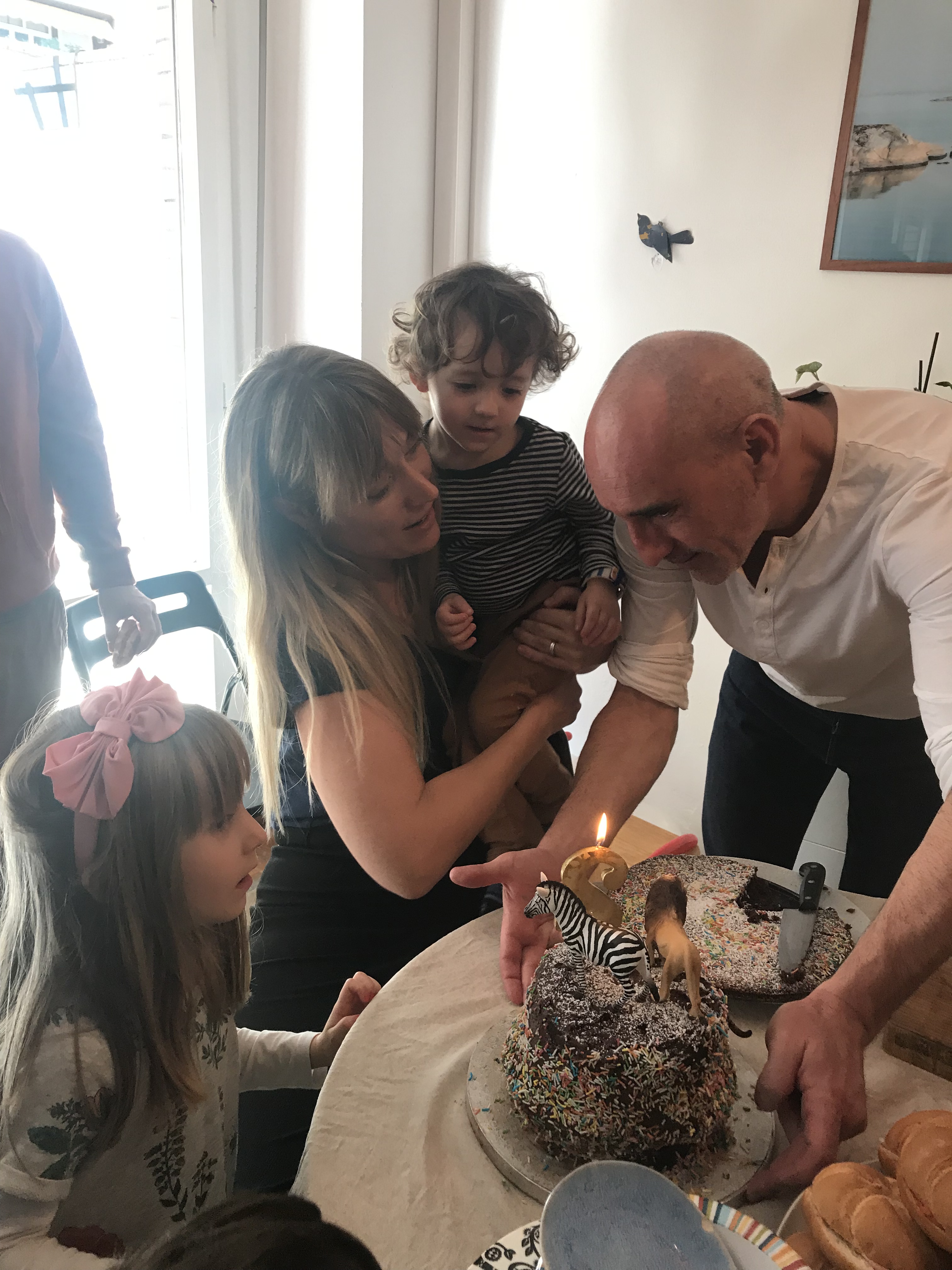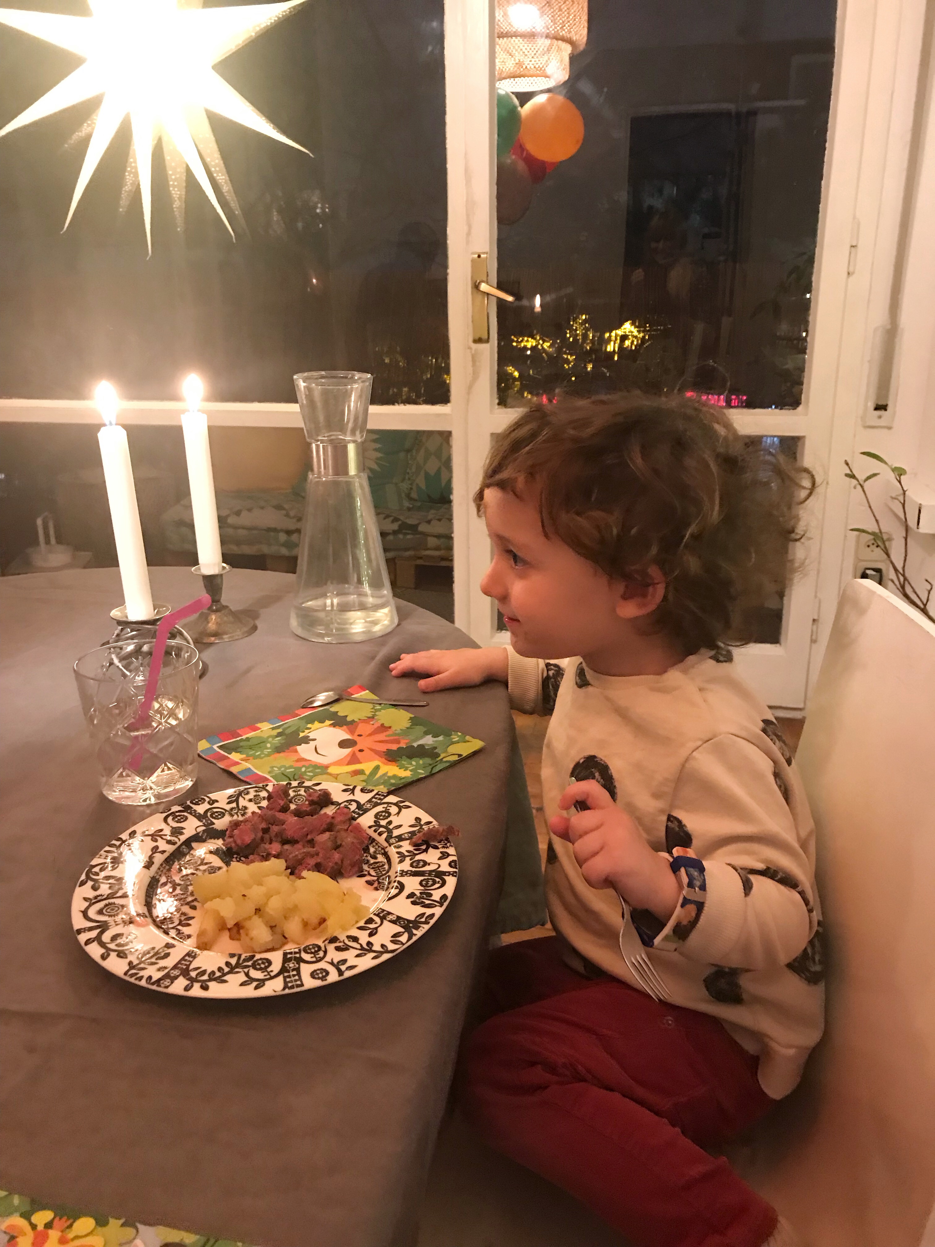 Han blev så glad på morgonen när vi sjöng och gav honom en croissant med ett ljus i, som han fick blåsa ut.