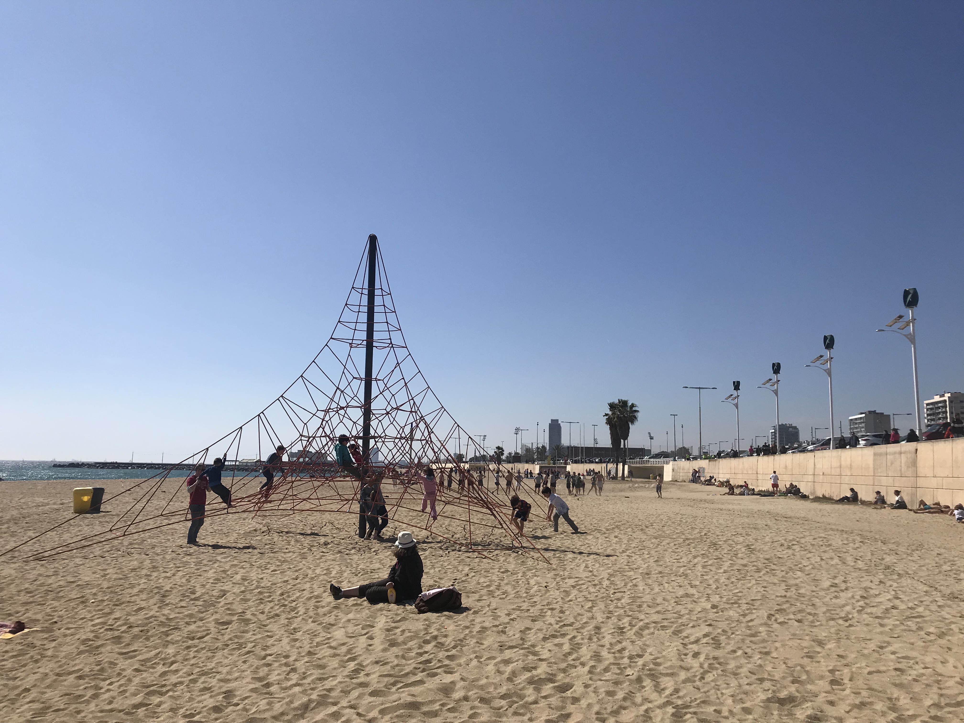 På lördagen var det soligt och fint så vi åkte ner till stranden. Det är inte bikini-väder, även om många turister ligger och solar men jag tycker det är så härligt att se, höra och känna doften av havet. Och Juni älskar dessa pyramid-liknande klätterställningar.