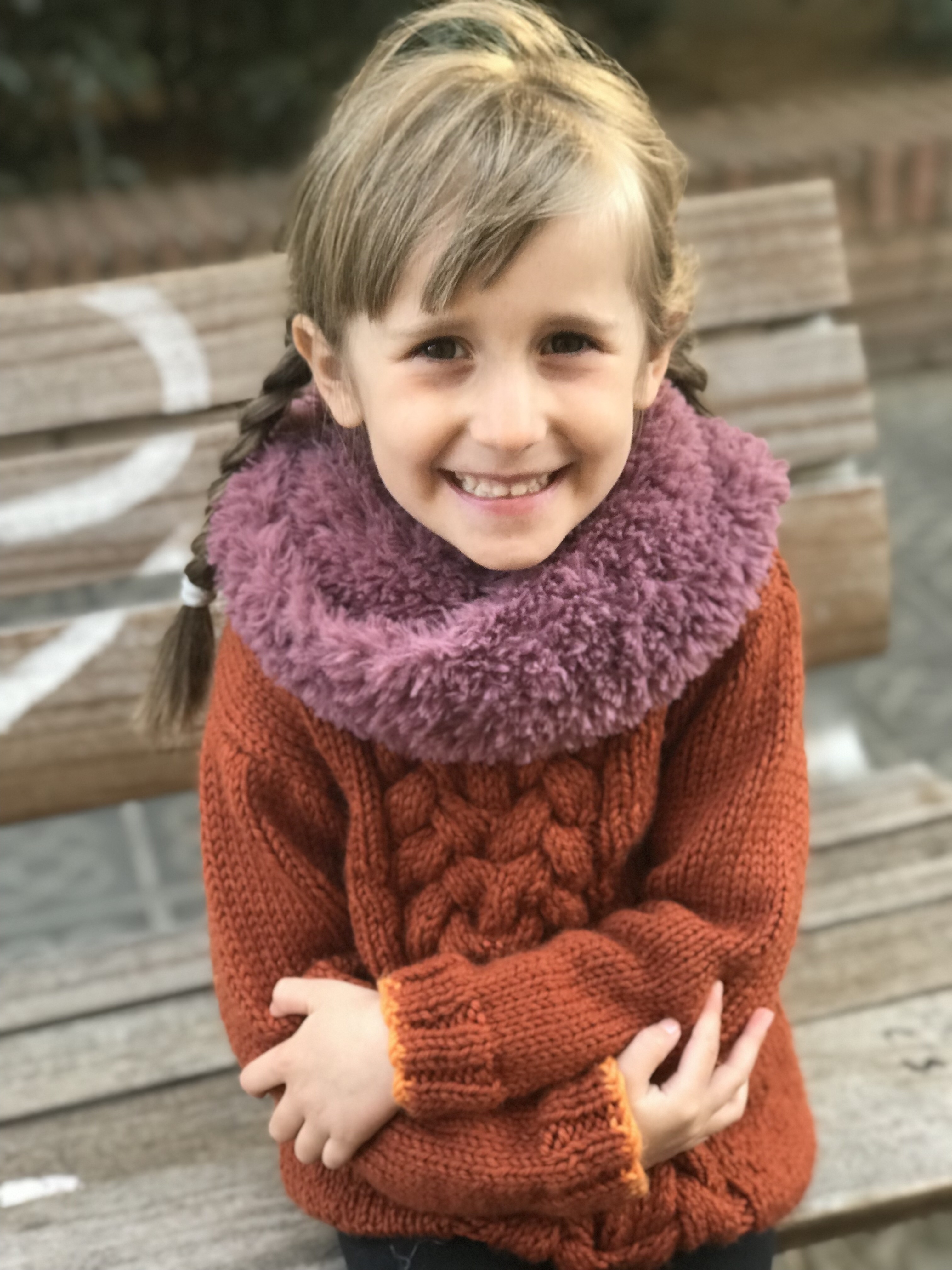 Igår morse tog jag denna bild på Juni när vi satt på busshållplatsen och väntade på en bänk. Hon har fått en ny tröja av sin farmor som Rosa själv stickat och Juni var så glad.