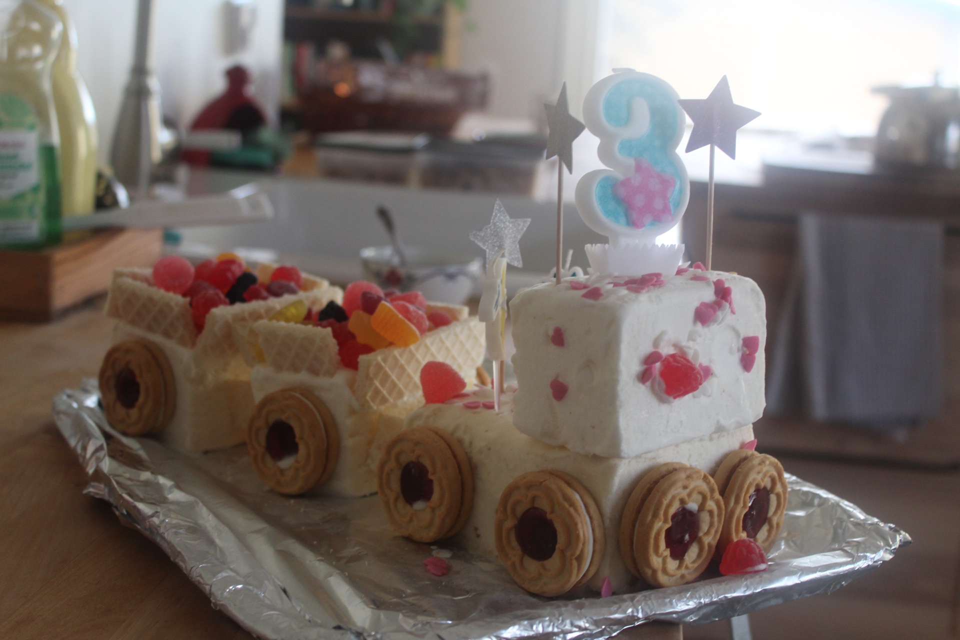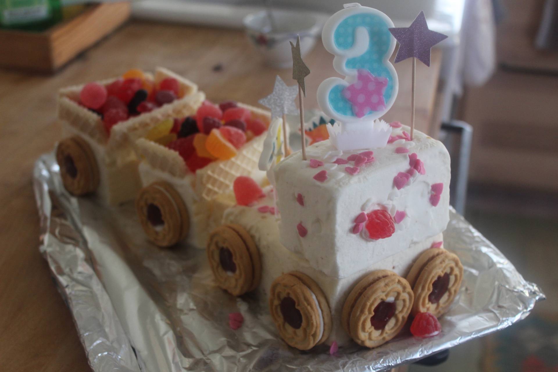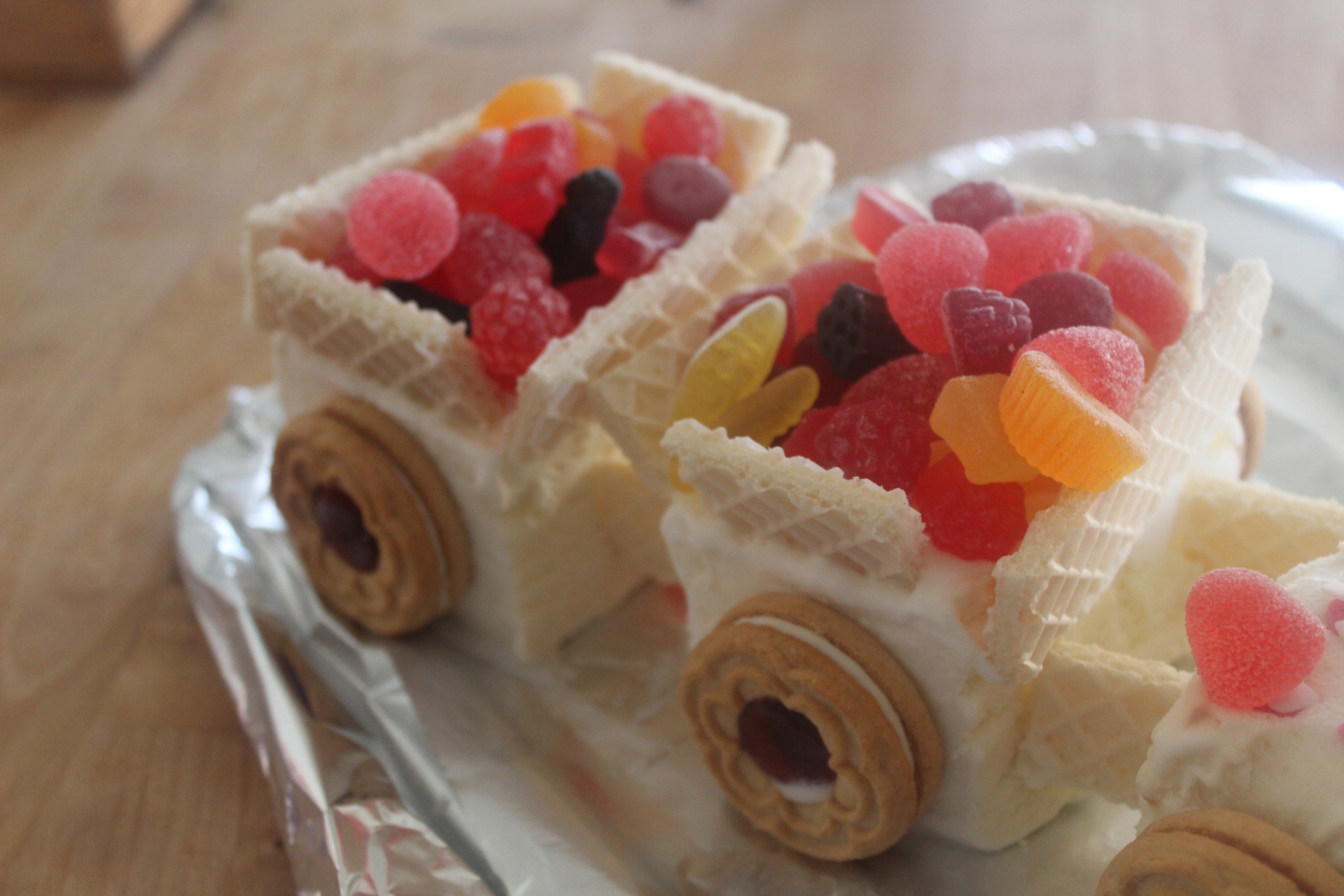 Det var otroligt enkelt och lätt och barnen hjälpte till att sätta på hjulen och göra vagnarna av våffelkex. Så tips, tips till er andra som har glass-älskande barn. Denna tårta åt de upp!