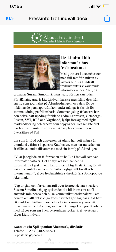 Hej fina ni! Nu tänkte jag berätta om en ny grej som varit på gång i mitt jobbliv sedan en månad tillbaka. Från och med december kommer jag att vikariera Susann Simolin och jobba som Ålands fredsinstituts informatör och kommunikatör.